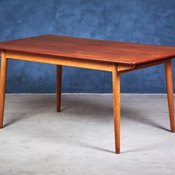 Solid dining table in teak and oak. Not very offen you see solid teak top on tables. Very beautiful table and the oak and teak works perfectly together. Two extension folding plates can be mounted in some brass brackets. Would be a great addition to any modern dining room.