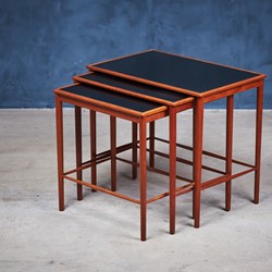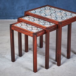 A set of 3 rosewood nesting tables with inlaid tile tops from the 1960s Danish Modern era. Beautiful clean lines with a slender compact form and designed with rails on the underside for easy removal and storage of each table. Ideal for those occasions where an additional side table is required. Additional measurements available upon request.