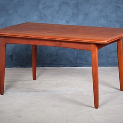 A beautiful teak dining table which is well suited for smaller spaces and proves to be very functional thanks to its two extendable Dutch leaves. The leaves fit nicely under the tabletop and their ends add nicely to the design. This table would make a great addition to any modern dining environment. Each pull out leave is 47cm.
