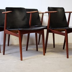 This set of 4 dining chairs by Farstrup is in very good condition with only a few normal signs of use, strong and stable with no loose joints. The backrest is made of teak, the frame of beechwood. This chair is also called "The Smile" because of the curved backrest. They have been reupholstered with black artificial leather and got new foam. Would be a great addition to any modern dining environment.
