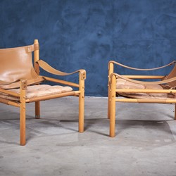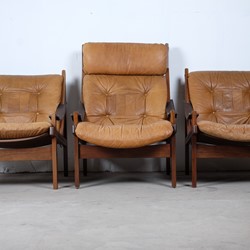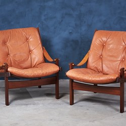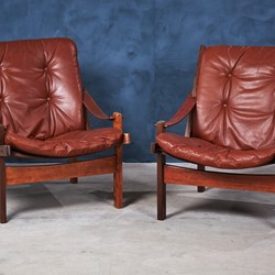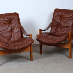 This amazing set of Hunter Safari chairs was designed by Torbjörn Afdal for Bruksbo Norwegen in the 1960s. The set is in great vintage condition and would be a great addition to any modern home. The seats are covered with leather and have a really good seating comfort.