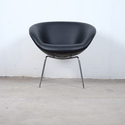 A stunning pot chair model number 3318 designed by Arne Jacobsen for Fritz Hansen in the 1950s. Reupholstered with black leather on chromed tubular steel legs, all in an excellent original condition.