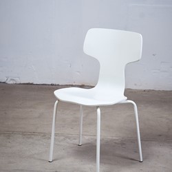 Seldom seen chair of bent white lacquered teak? plywood chairs from the 1960s. The children's model of the 'Hammer/T-chair' by Arne Jacobsen for Fritz Hansen.