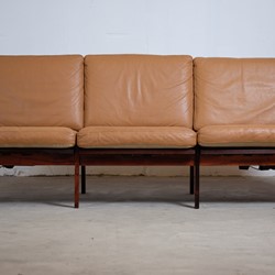 This beautiful rosewood sofa was designed by Illum Wikkelsø and manufactured by N. Eilersen. This sofa also comes in a two-seater and there has also been made a easy chair in that series. The leather cushions are in good vintage condition with a great comfort. Their cognac colour is a great pairing to the contrasting amber and black grain of the rosewood. We also have a pair of matching easy chairs in stock which would make the perfect suite, however, both have to be reupholstered.