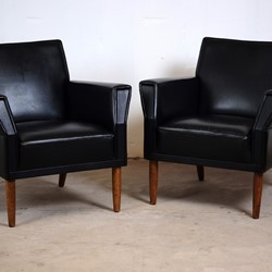 Stunning pair of easy chairs in black leather with solid legs in stained oak.