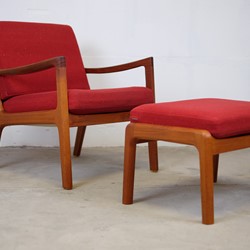This beautiful chair is not often seen and rare to find as a pair. The chair is made in solid teak, and the flip-out part for the stool is made in solid oak. I'm not sure that the fabric is original, but the condition is useful.
