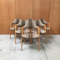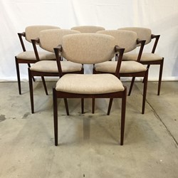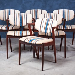 These chairs exude quality and if you know Kurt Østervig, you know the standard. One of the largest Danish designers. These chairs are not often seen and have not been in production for more than a year or two in the 60s. A beautiful set of 6 beautiful chairs, newly refurbished and on the customer's request, can get leather instead of fabric, or just new Fabric. This set would make an great addition to any modern dining environments.