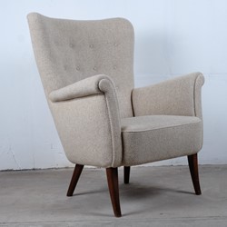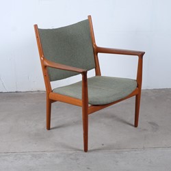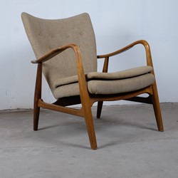 Stunning lounge chair in wool with arms and legs in solid teak.
