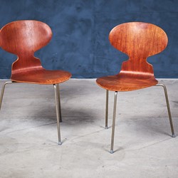 This set of two very early three-legged model 3100 'Ant' chairs was designed by Arne Jacobsen for Fritz Hansen in 1952. The seat is made of molded teak veneer plywood and the base is made of brushed steel.The chairs has a nice patina and is in good vintage condition, would be a great addition to any modern home.
