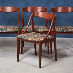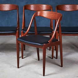 Set of four beautiful ladies! 'Juliane' chairs in teak by one of our greatest designers. This Danish mid-century chair was designed by Johannes Andersen for Vamo Møbelfabrik during the 1960s. The teak frame is in a beautiful organic design with incredibly details. The seats are padded with red leather seats.