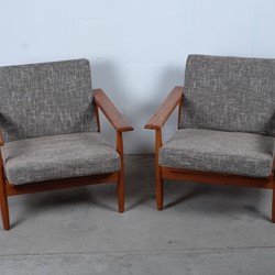 Beautiful set of minimalist lounge chairs in teak. The chairs provides really good seating comfort and would be a great addition to any modern environment. Danish design, from the 1960s era. The cushions are in wool and with springs, the cushions are in vintage condition, with few signs of patina.