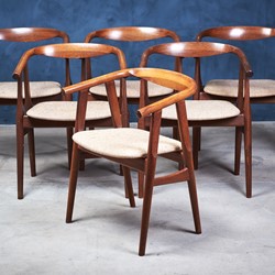 Very beautiful set of six dining chairs by Kai Kristiansen for Korup Stolefabrik. The chairs feature a comfortable curved back in teak with beautiful armrests also in teak. For an extra fee you can get the cover changed at a professional upholsterer just like you like it, in wool, real leather or fabric. The same is possible if you like the chairs sanded and treated with something at a professional carpenter.