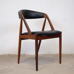 A beautiful set of four teak dining chairs by Kai Kristiansen. The comfortable and timeless Danish Classic, 'model 31'. Produced in Denmark, circa 1960. These four chairs is upholstered with artificial leather on seat and back which are in good vintage condition with no holes or deep scratches. These chairs would be a great addition to any dining room environment.