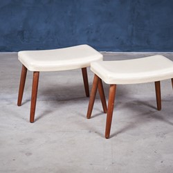 Set of 2 stools with inclined legs in solid teak and cover in artificial leather. Made in Denmark around the 60s and have been in the same home since. The stools are in good vintage condition and would be a great addition to any modern environment.