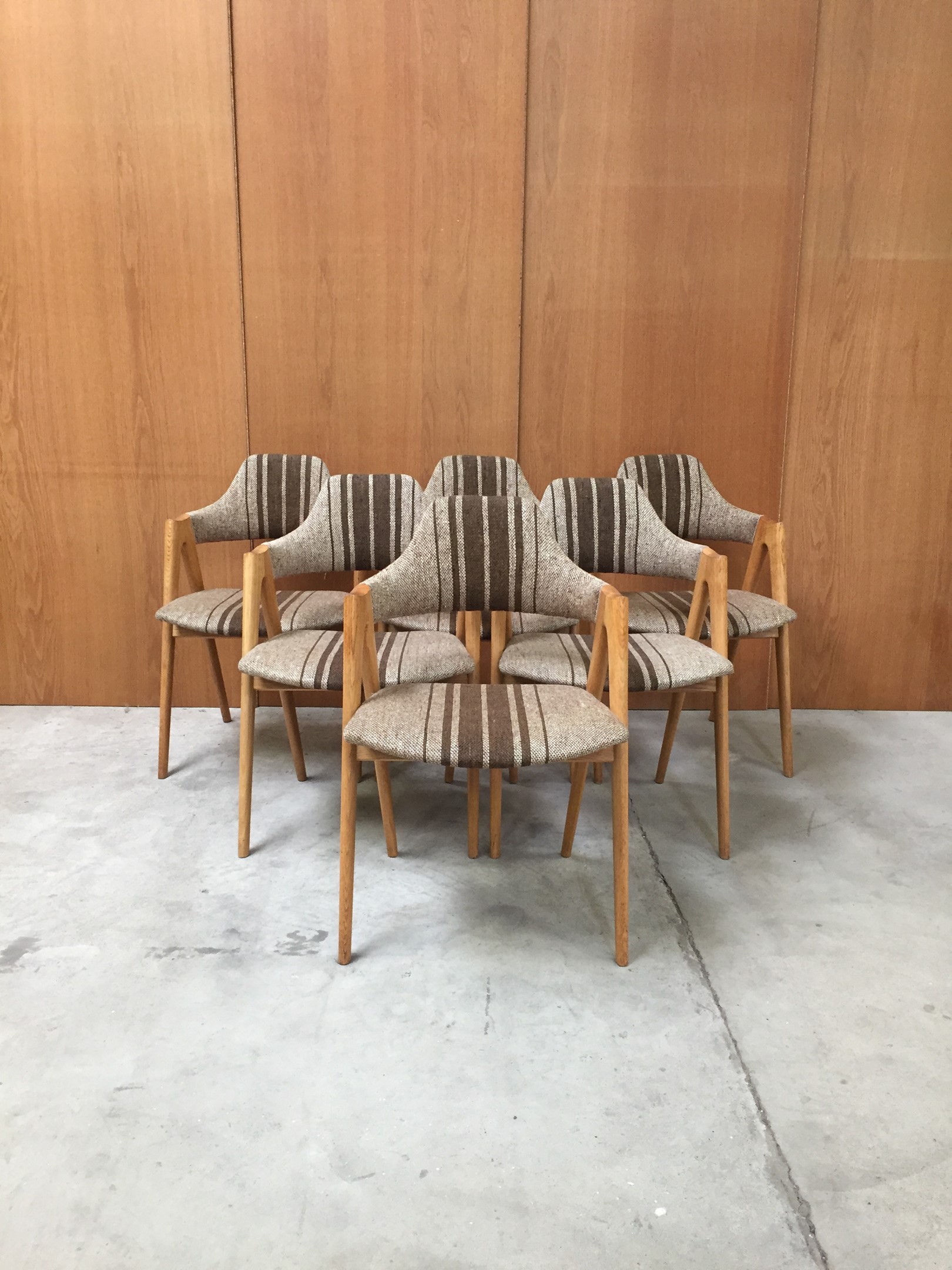 Six beautiful dining chairs in oak designed by Kai Kristiansen. The chairs are in good condition and no stains on the fabric.