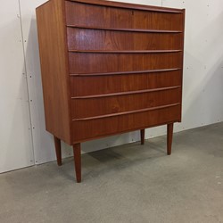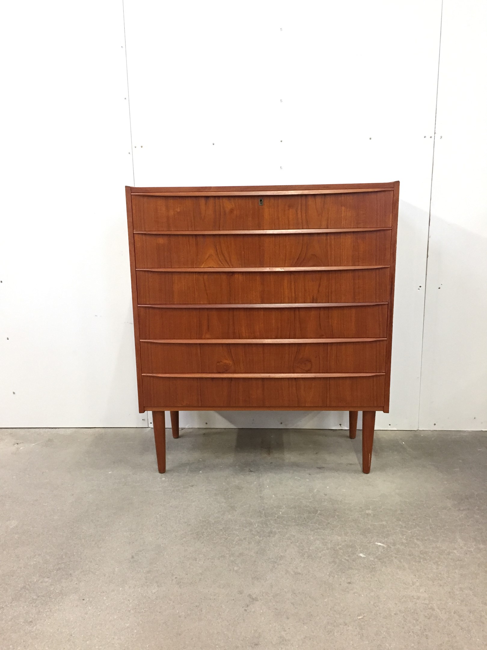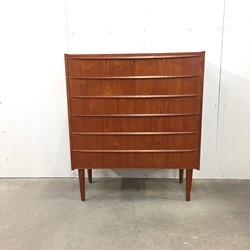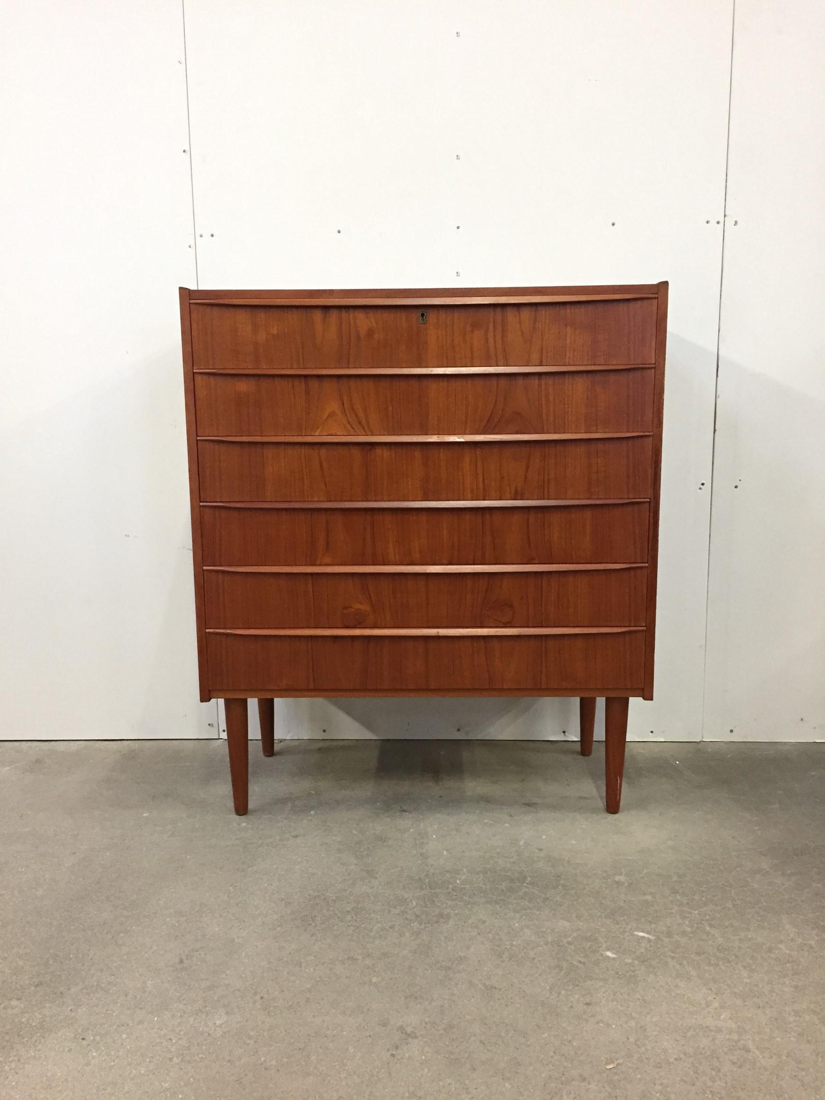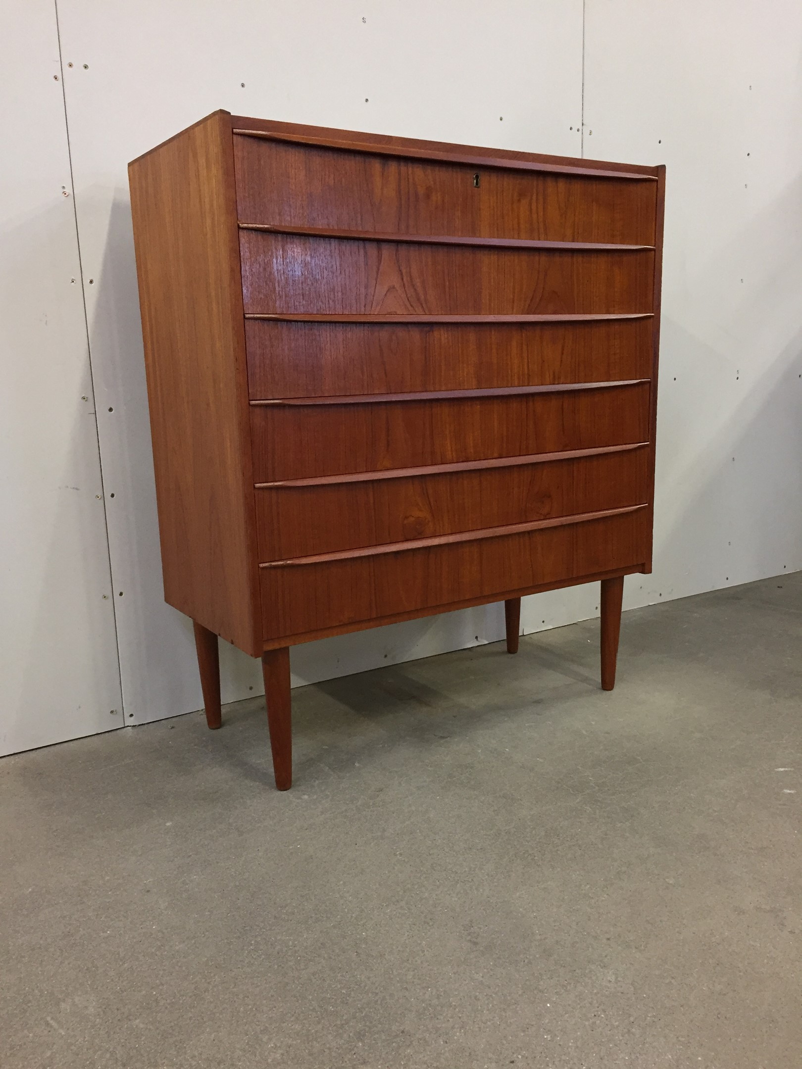 Tall Teak Dresser with six wide drawers and conical legs. Very beautiful dresser and in good condition.