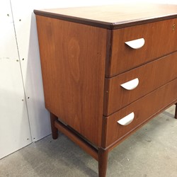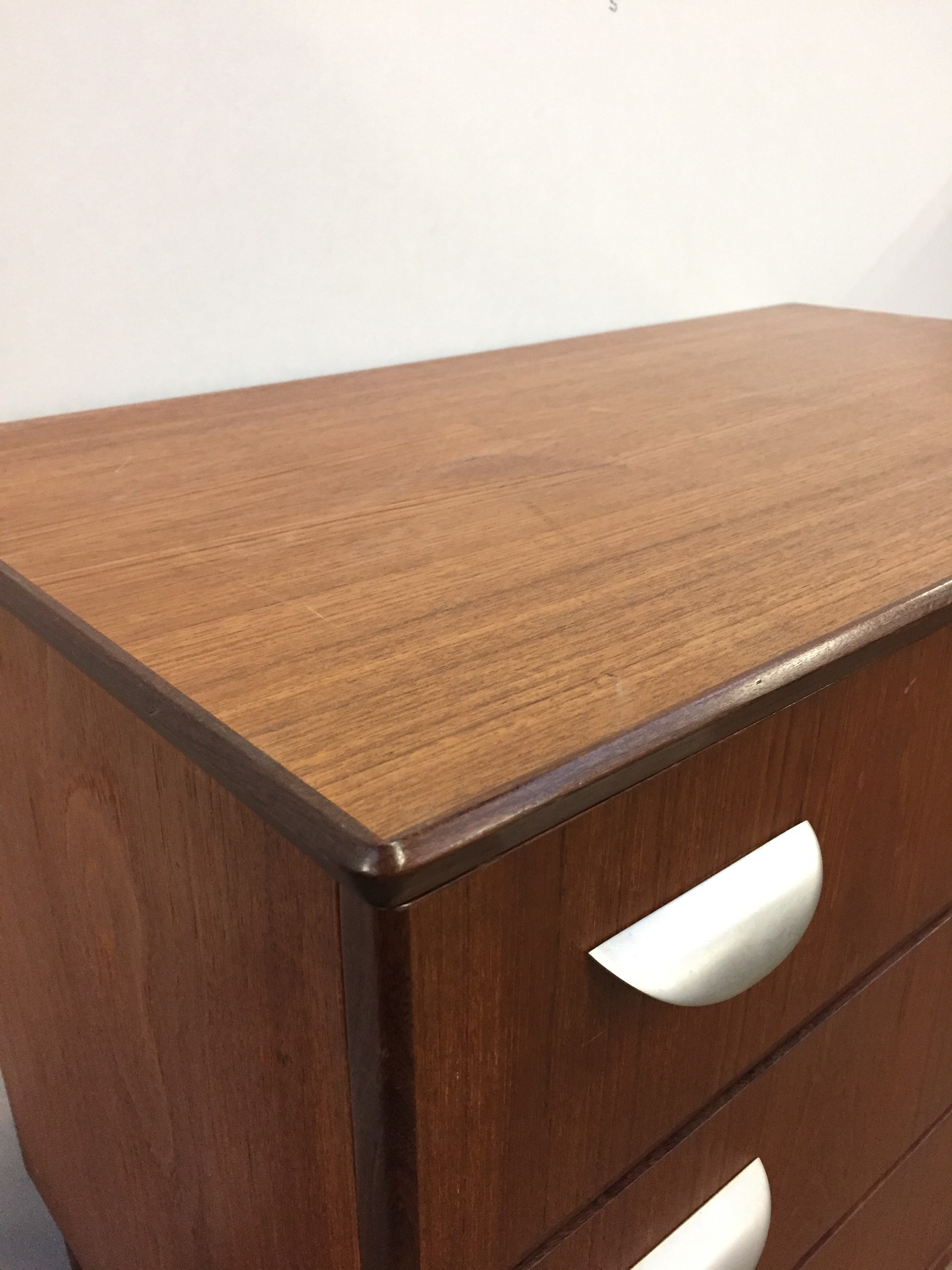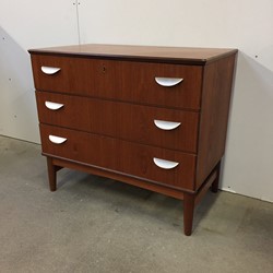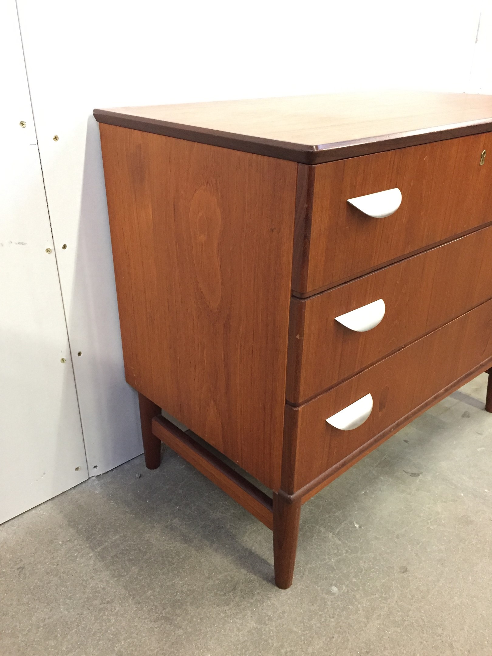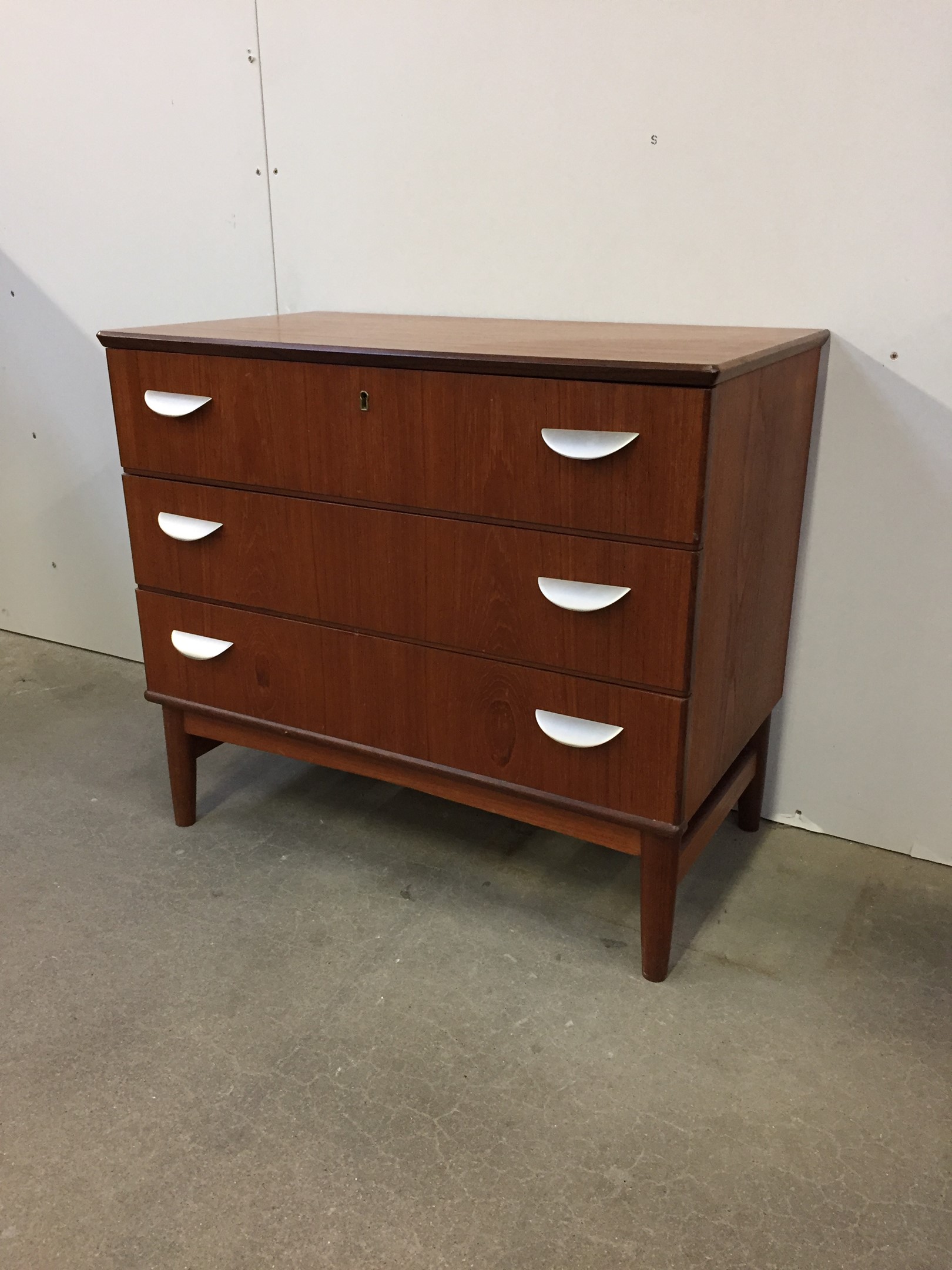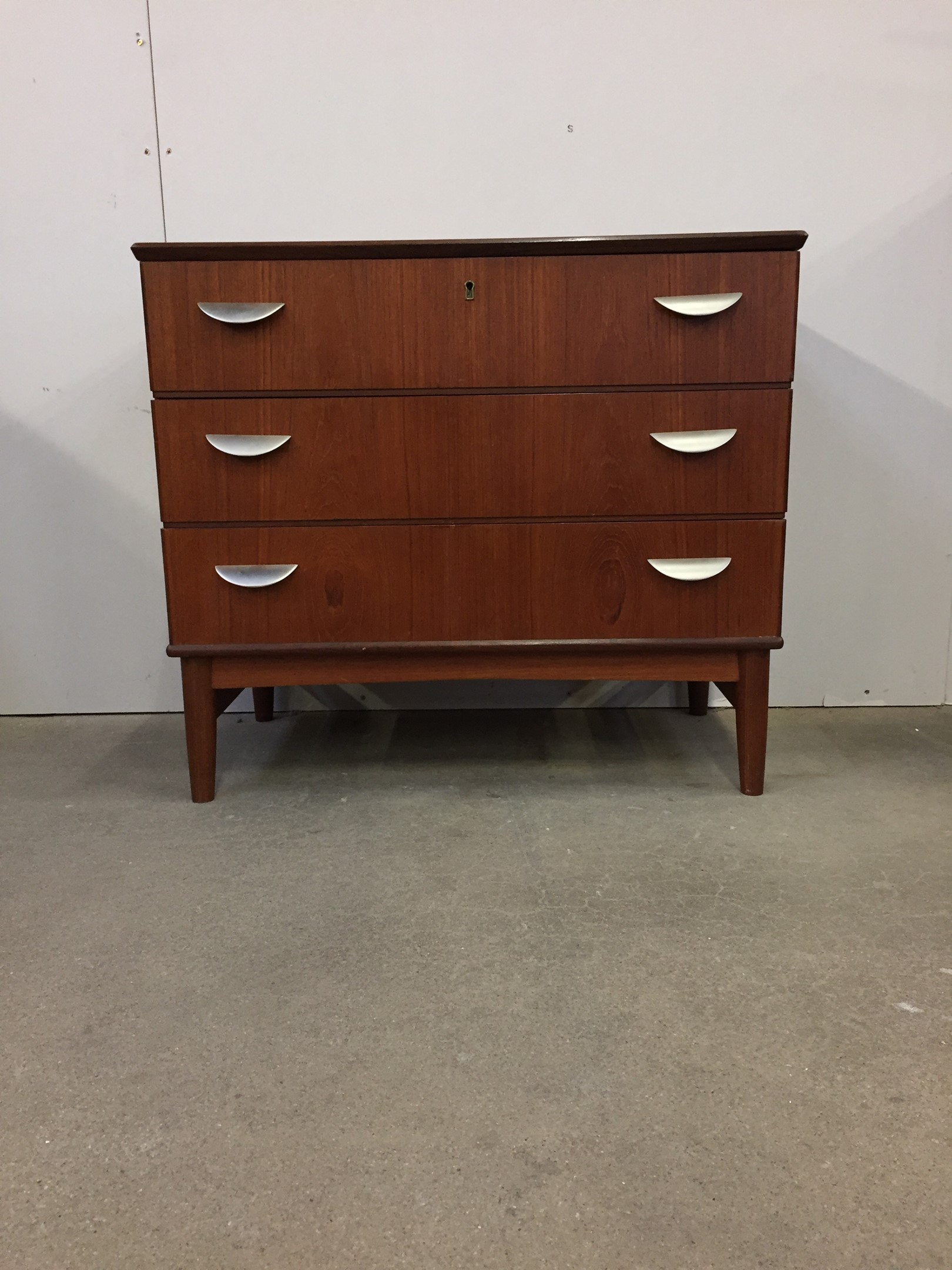 Beautiful 3-Drawer chest in teak with steel handles. Upper drawer is fitted with a lock. The ood condition