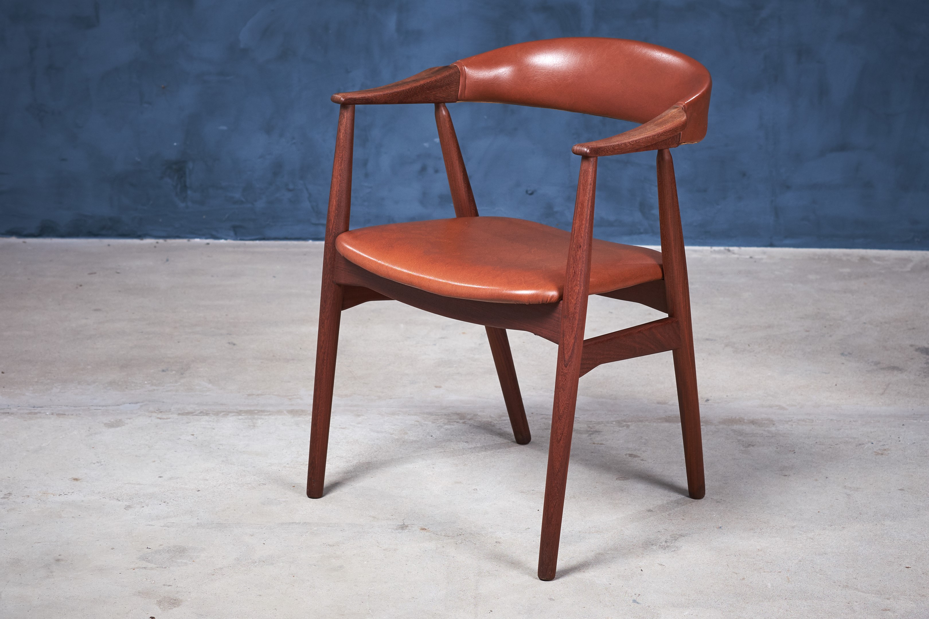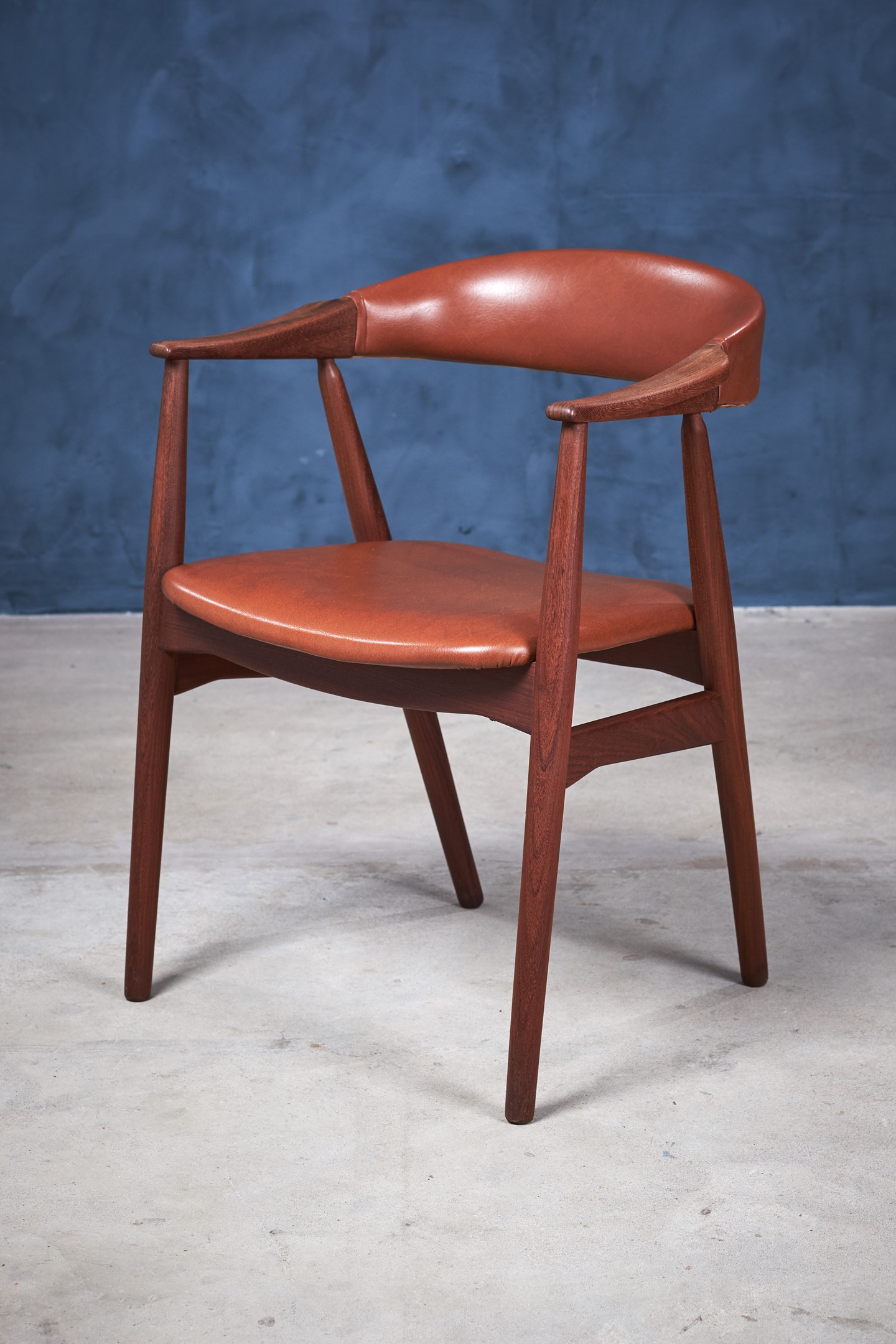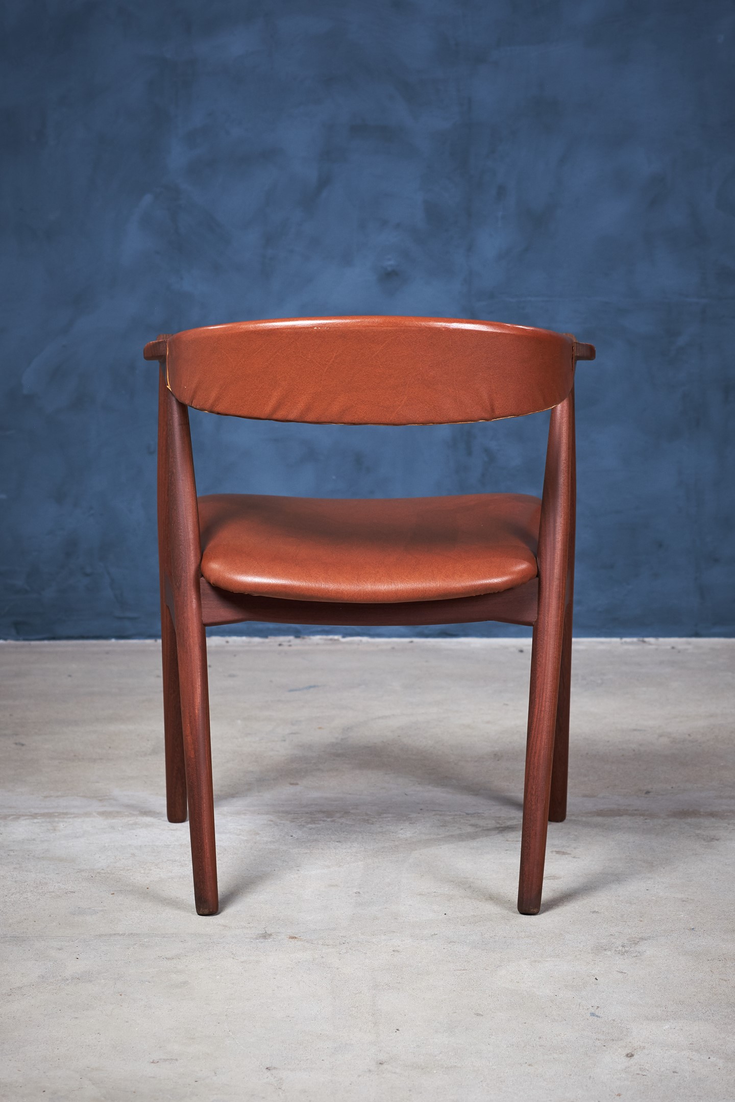 Armchair in teak by Thomas Harlev for Farstrup (Model 213) Upholstered in red-brown artificial leather, featuring beautiful curved backrests. Very comfortable chair from the mid-century, Danish design. This chair would make an great addition to any modern environment. Price is for one chair, 4 chairs available.