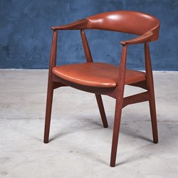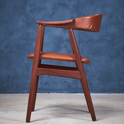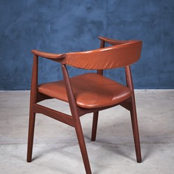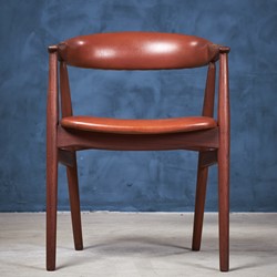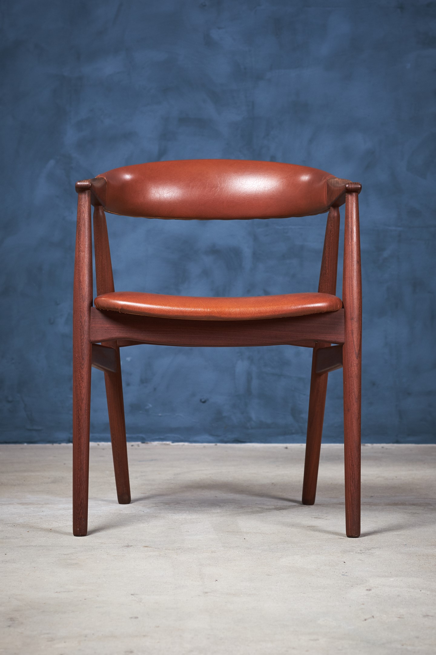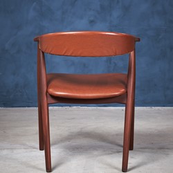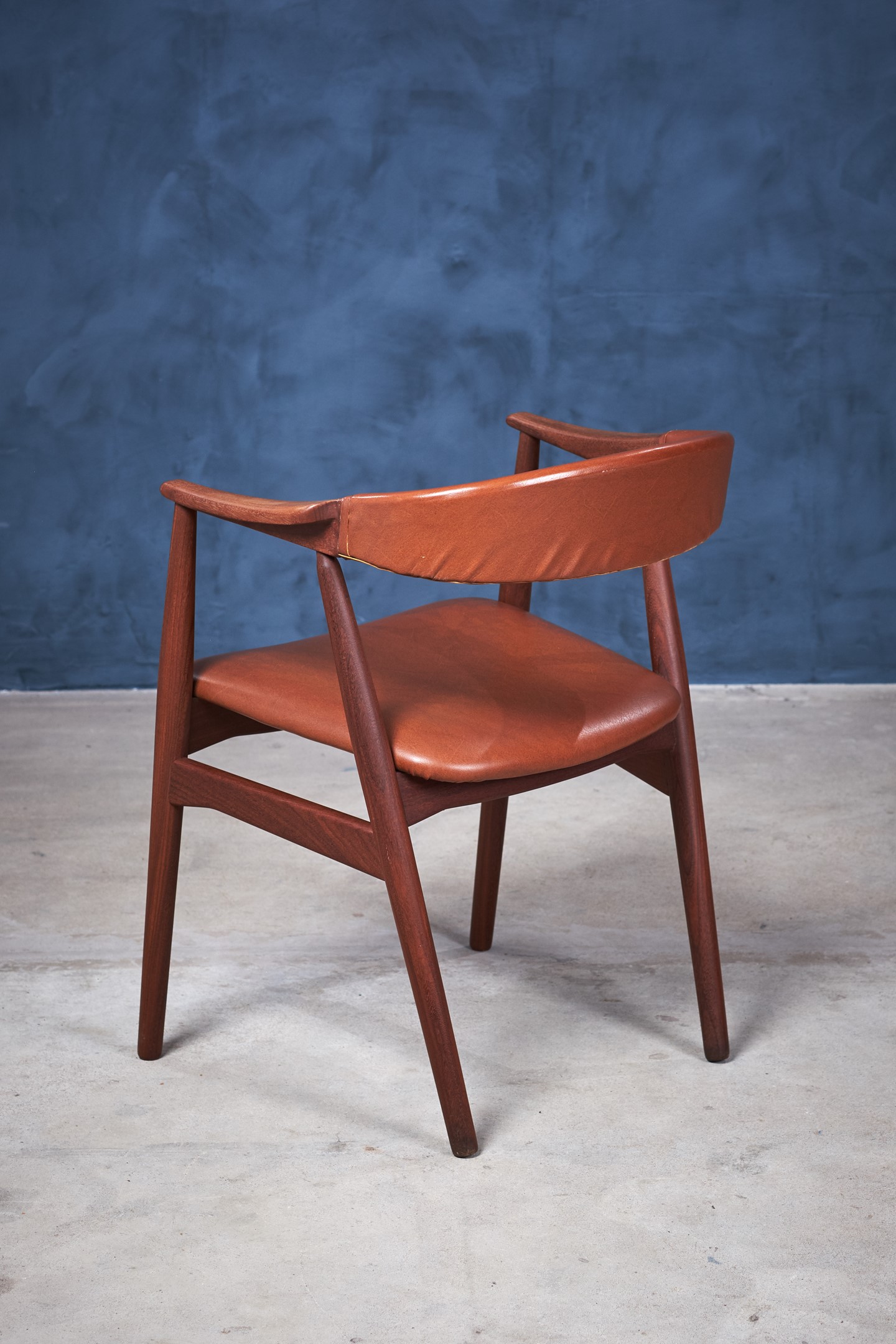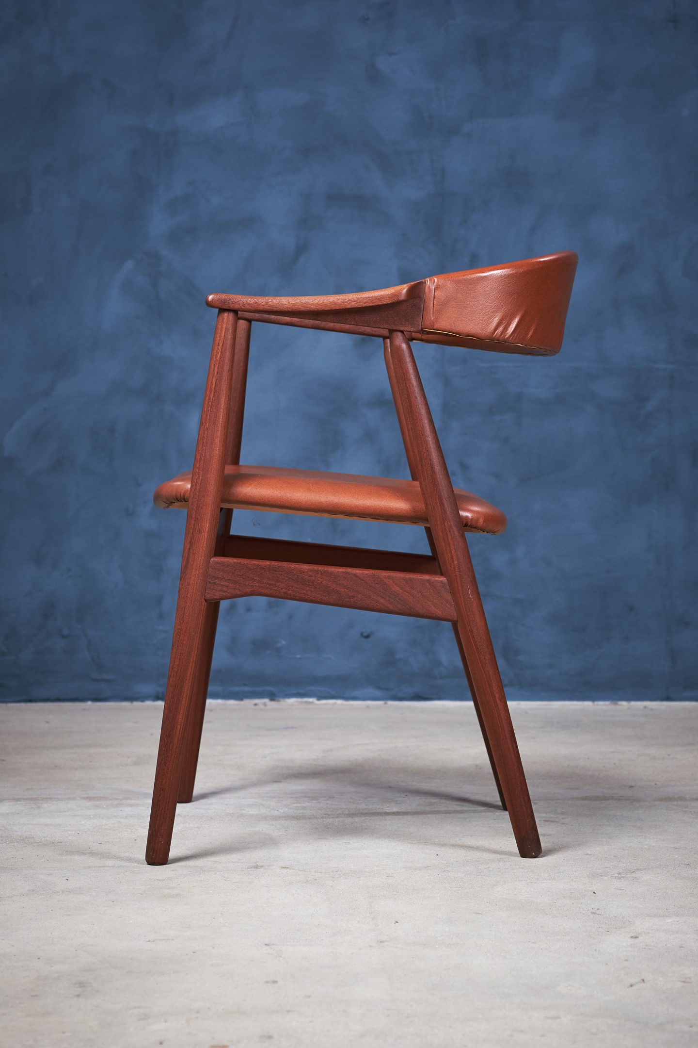 Armchair in teak by Thomas Harlev for Farstrup (Model 213) Upholstered in red-brown artificial leather, featuring beautiful curved backrests. Very comfortable chair from the mid-century, Danish design. This chair would make an great addition to any modern environment. Price is for one chair, 4 chairs available.