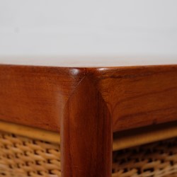 This stunning teak sewing table was designed in the 1960s and is comprised of a woven rattan basket below with drawer inside fitted for sewing implements. Although the piece was designed to house sewing tools, it can just as easily accommodate media accessories or magazines. Very lovely piece, the basket is in a very good condition and the top plate have some small scratches and marks, age-related wear. The sewing table can be sanded and oiled before delivery, so it's going to be like new.