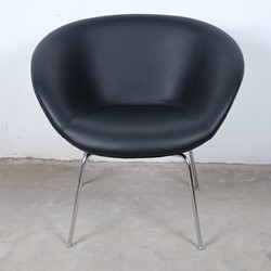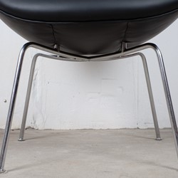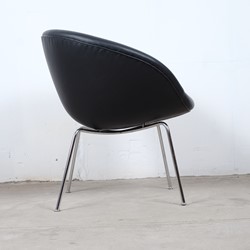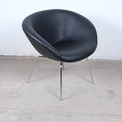 A stunning pot chair model number 3318 designed by Arne Jacobsen for Fritz Hansen in the 1950s. Reupholstered with black leather on chromed tubular steel legs, all in an excellent original condition.