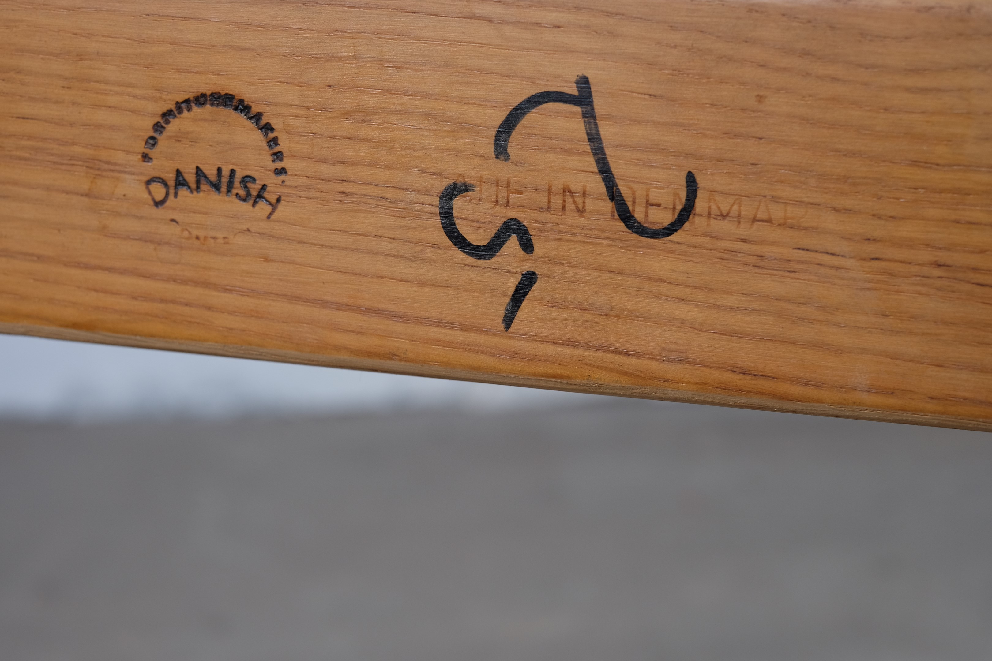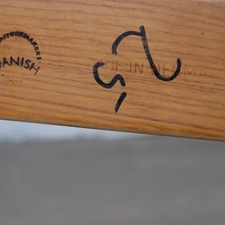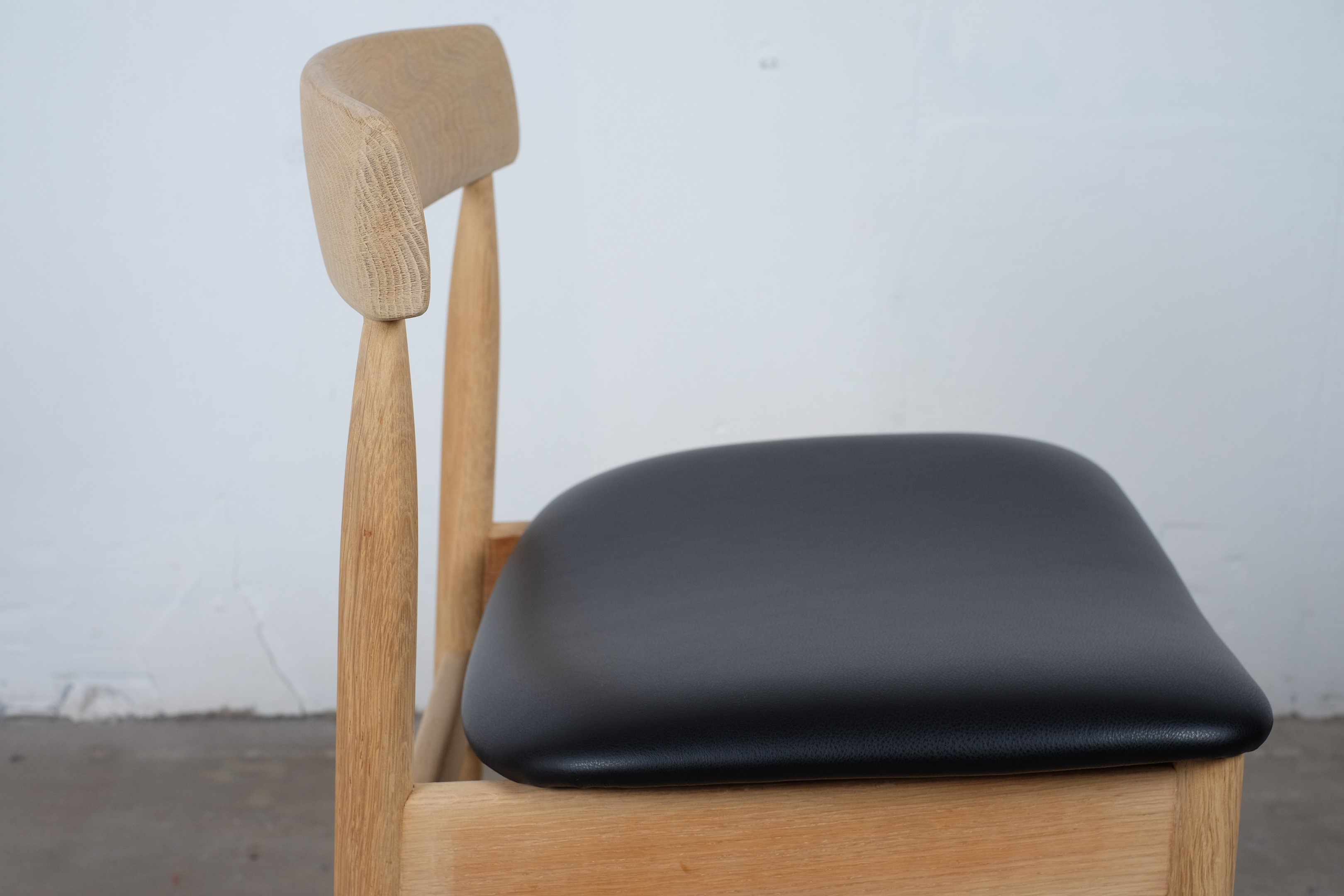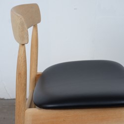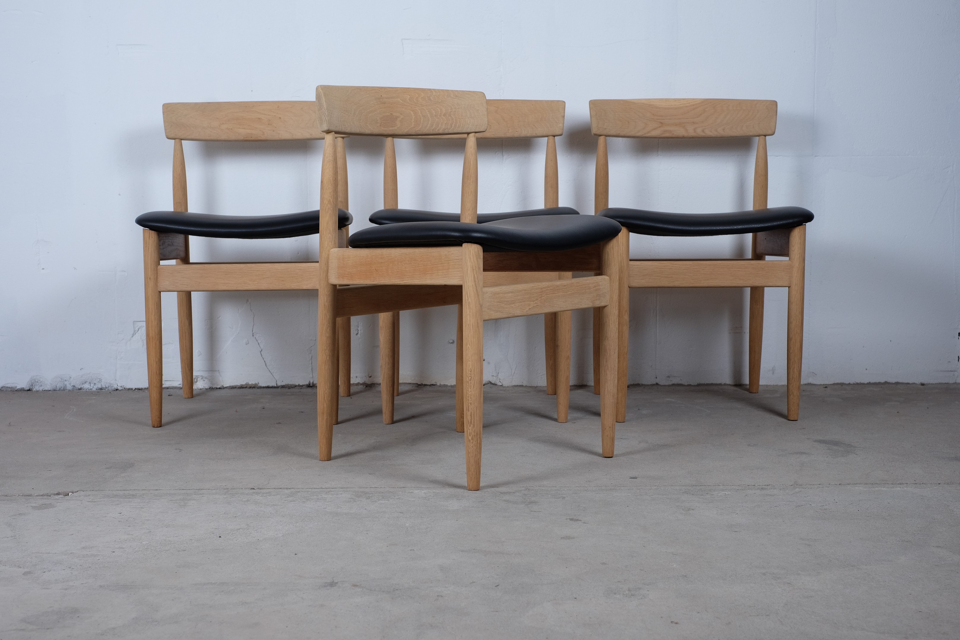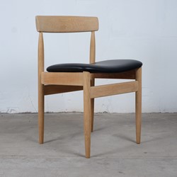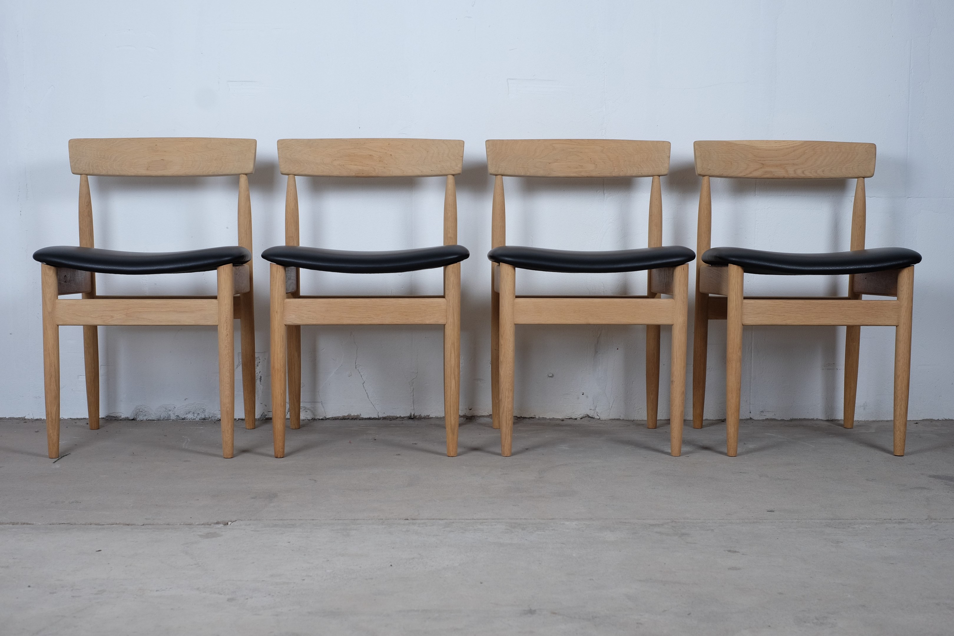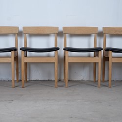 Beautiful set of four vintage dining chairs in solid oak, reupholstered with black leather. The chairs is furniture controlled and 'Made in Denmark' stamp but I haven't been able to find the designer of this chair.