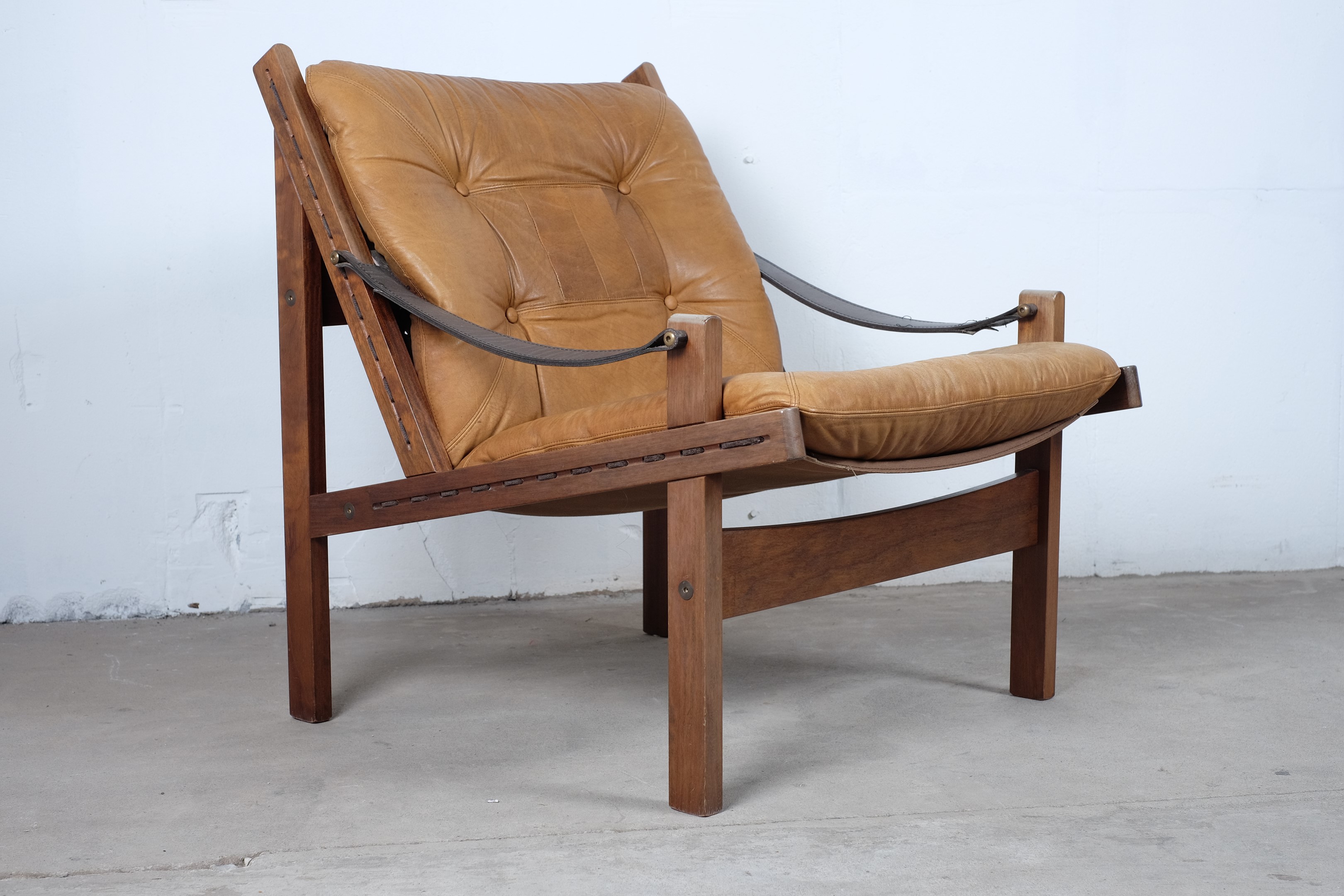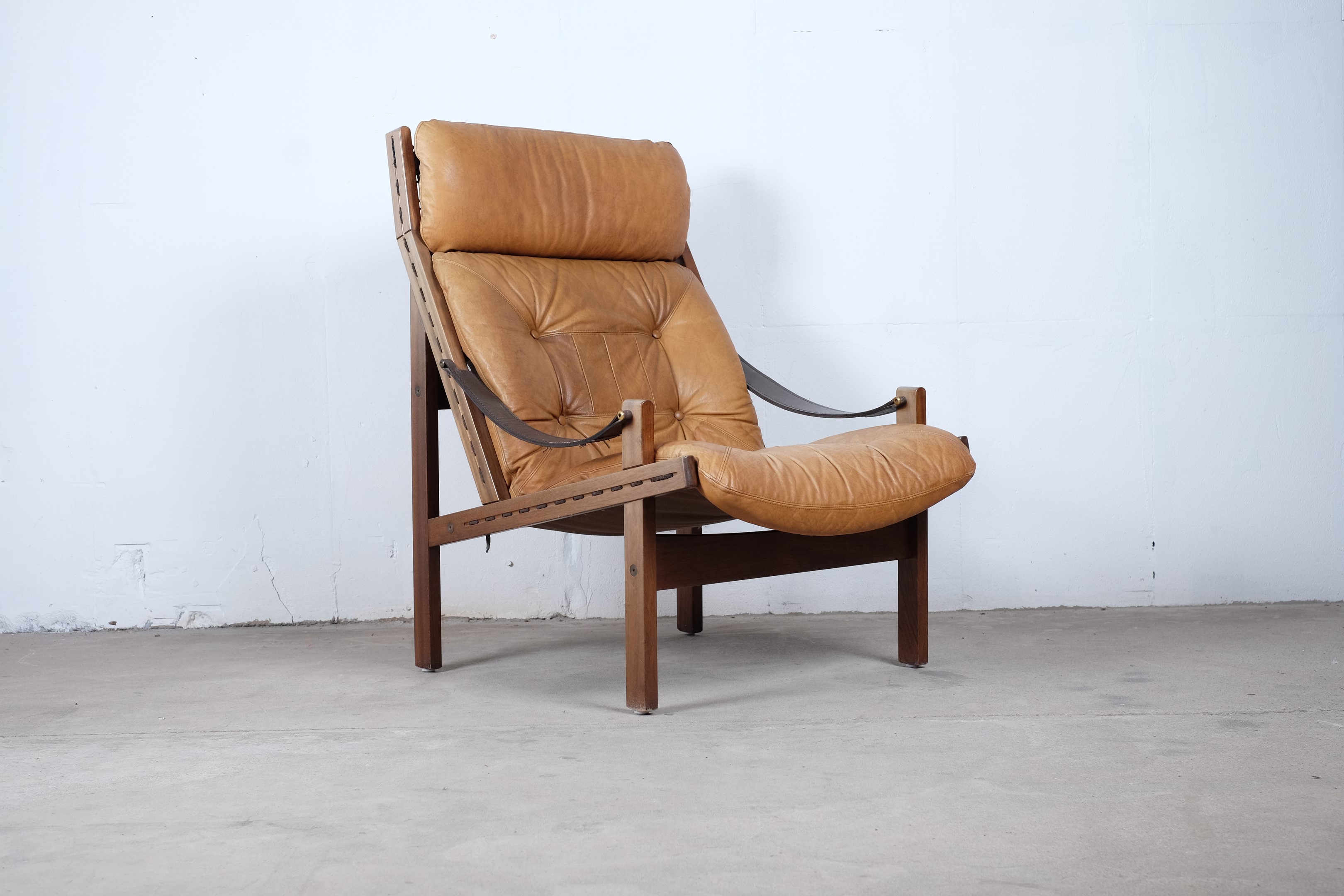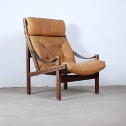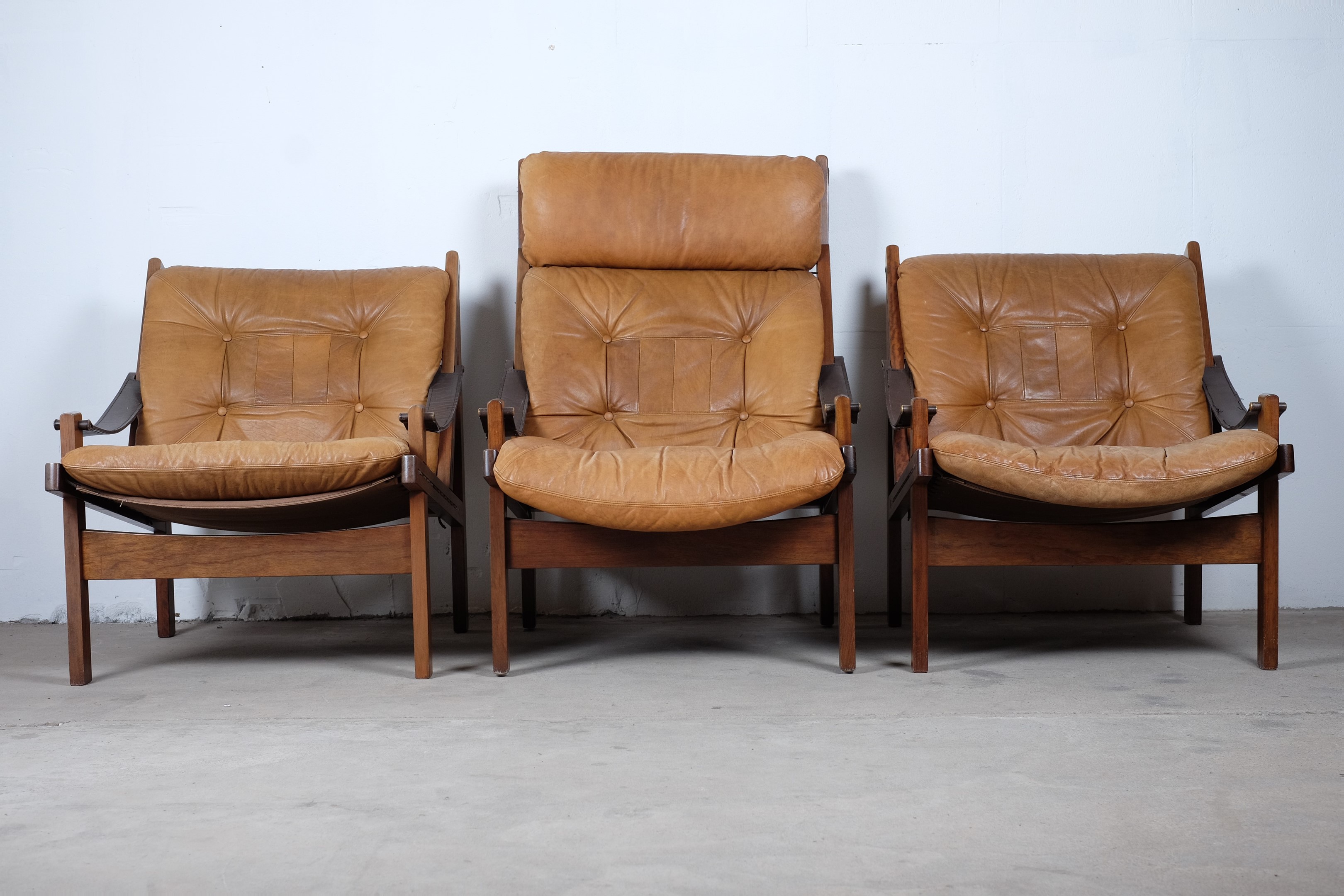 A matching set of three easy chairs two low back and one with high back, brown leather Hunter chairs designed by Torbjørn Afdal and manufactured by Bruksbo, Norway.