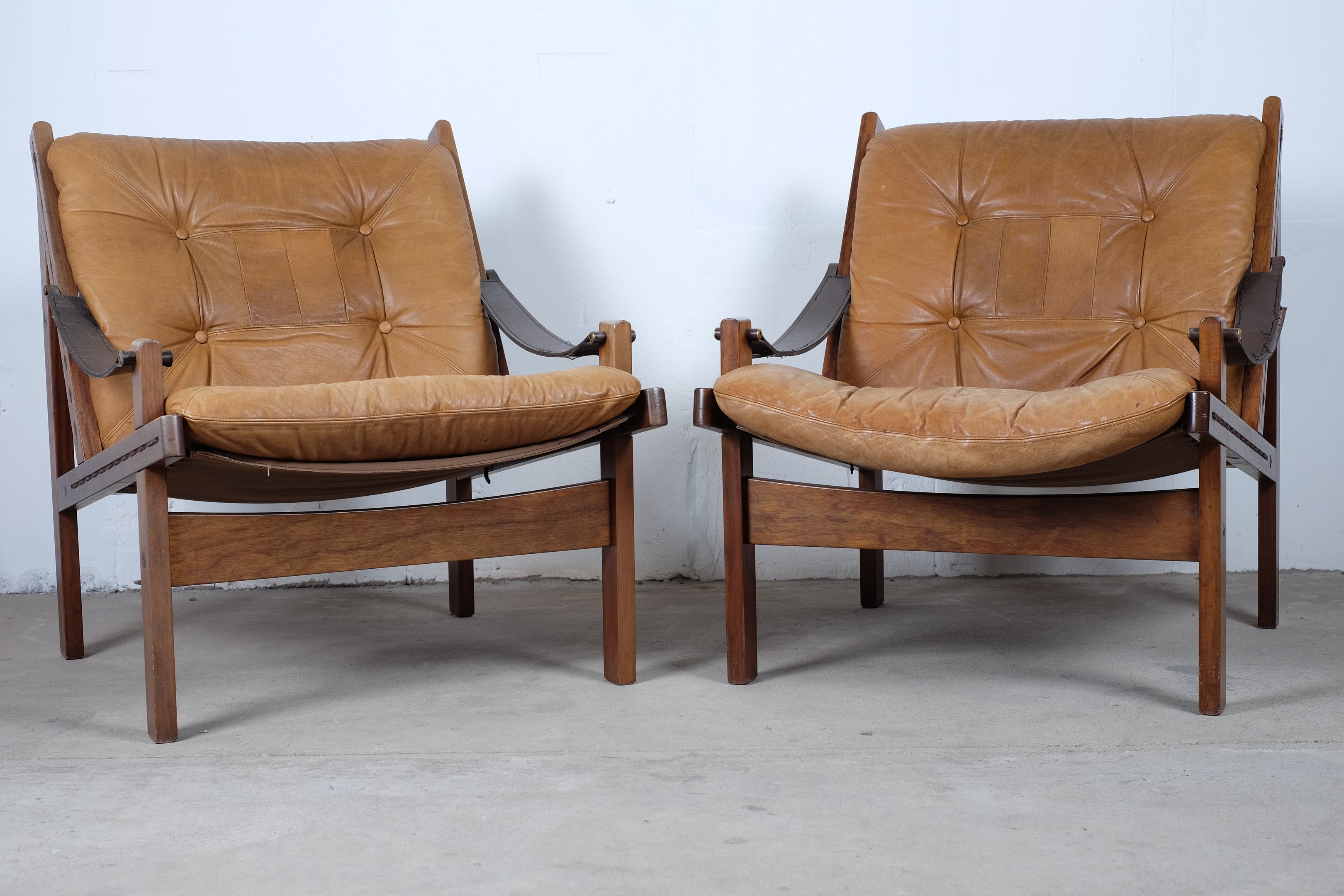 The chairs are in good but vintage condition, but some of the thick leather armrests needs to be sewed (look photo) I will get that done at a professional before shipping. The chairs will be sent disassembled otherwise you need to use 1stdibs shipping.