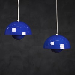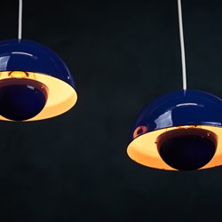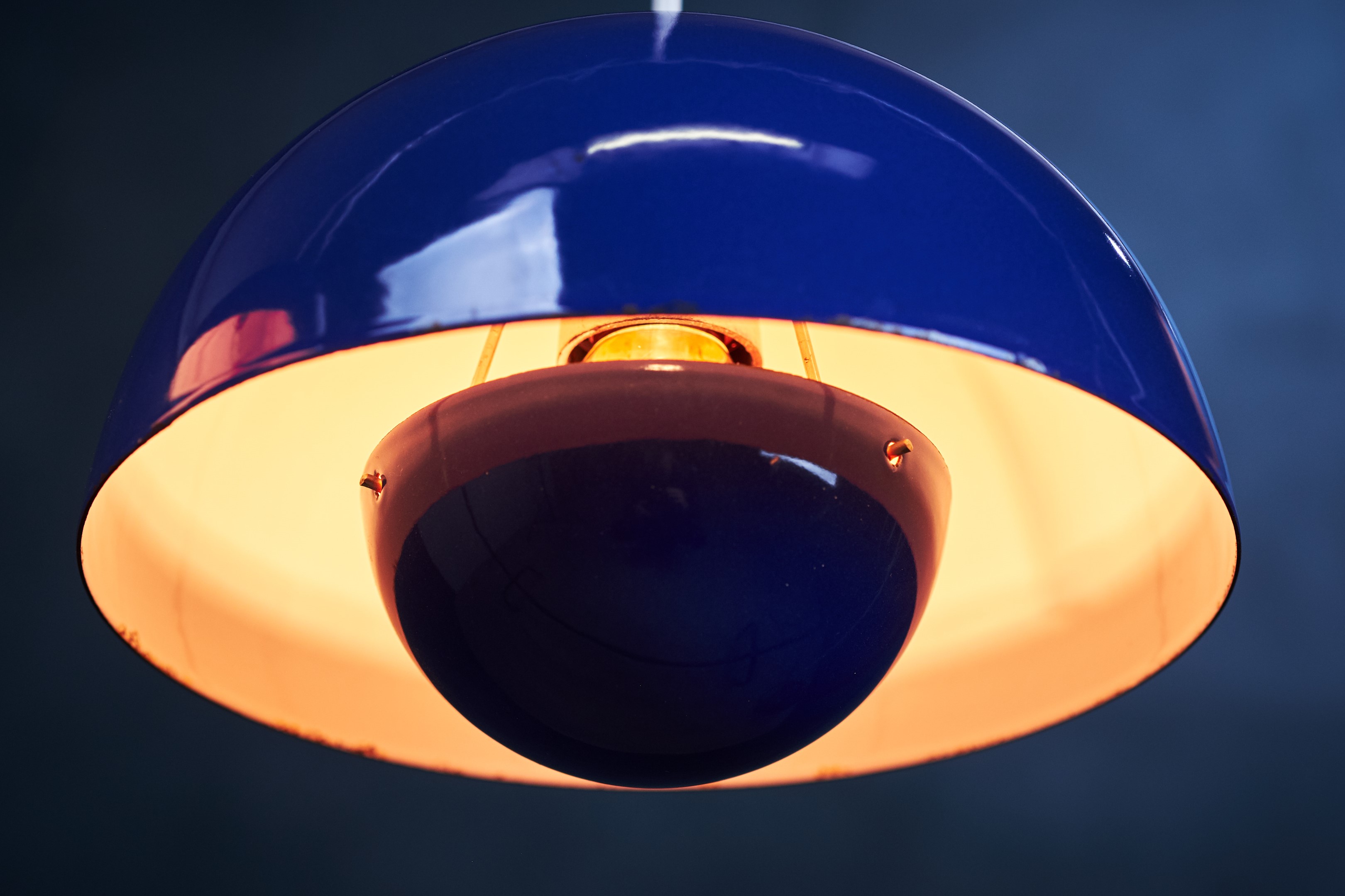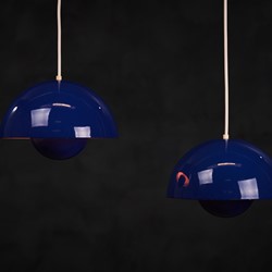 A pair of original 1960s Louis Poulsen production of Verner Panton's classic late 1960s Flowerpot lamp in a rich glossy blue enamel finish with a bright lipstick-red interior to the bulb-shielding undercup, a detail that remains invisible in normal use except in the warm reddish tint it adds to the light cast by the lamp. The lamps is in superb vintage condition, with some small chips to the enamel, and retains both its original porcelain Louis Poulsen bulb holder and the unique original Flowerpot sticker to the interior. It would be a beautiful addition to any kitchen or dining table, or perhaps in a living space spreading a warm light. All original, but rewired with 2 m (6′ 6.7″) black fabric cord – for safety and beauty. Tested and fully functional. Cleaned, labeled and packed in protective plastic cover.