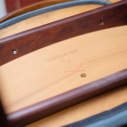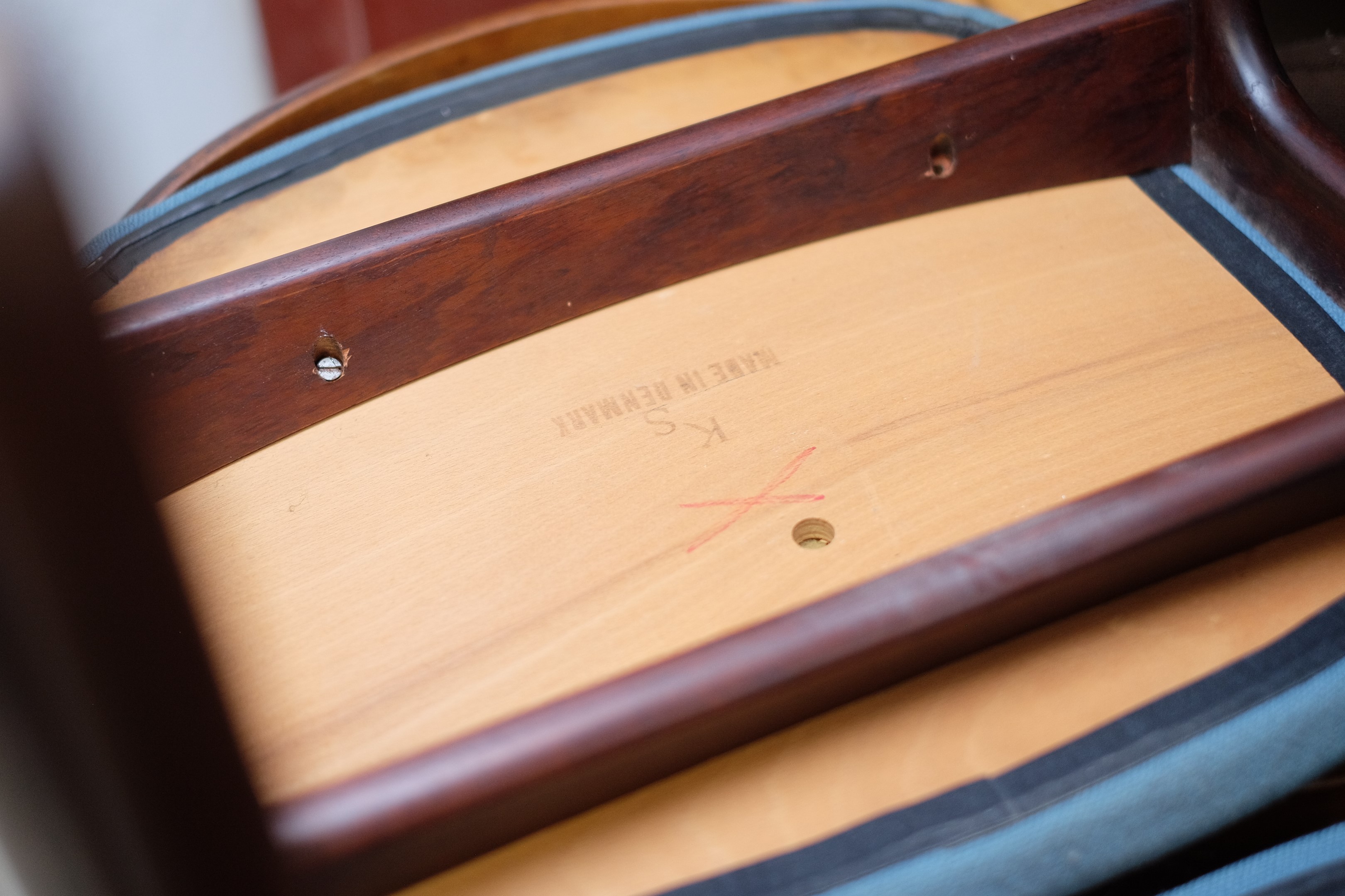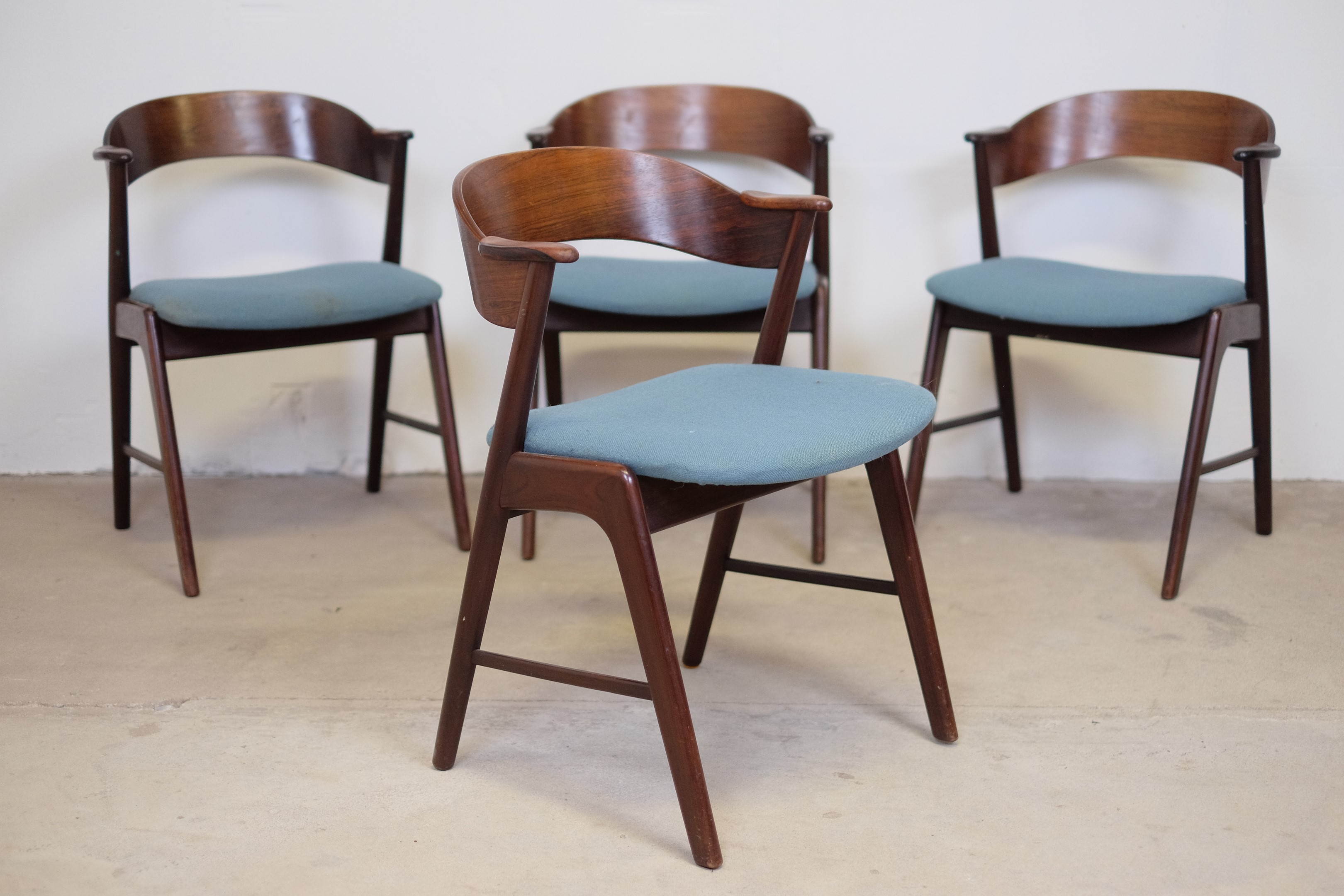 Very beautiful set of four dining chairs by Kai Kristiansen for Korup Stolefabrik. The chairs feature a comfortable curved back with beautiful armrests in rosewood. Stamped "K/S Made in Denmark," on the underside. For an extra fee you can get the cover changed at a professional reupholsterer just like you like it, in wool, real leather or fabric. The same is possible if you like the chairs sanded and treated with something at a professional carpenter. Everything is possible!