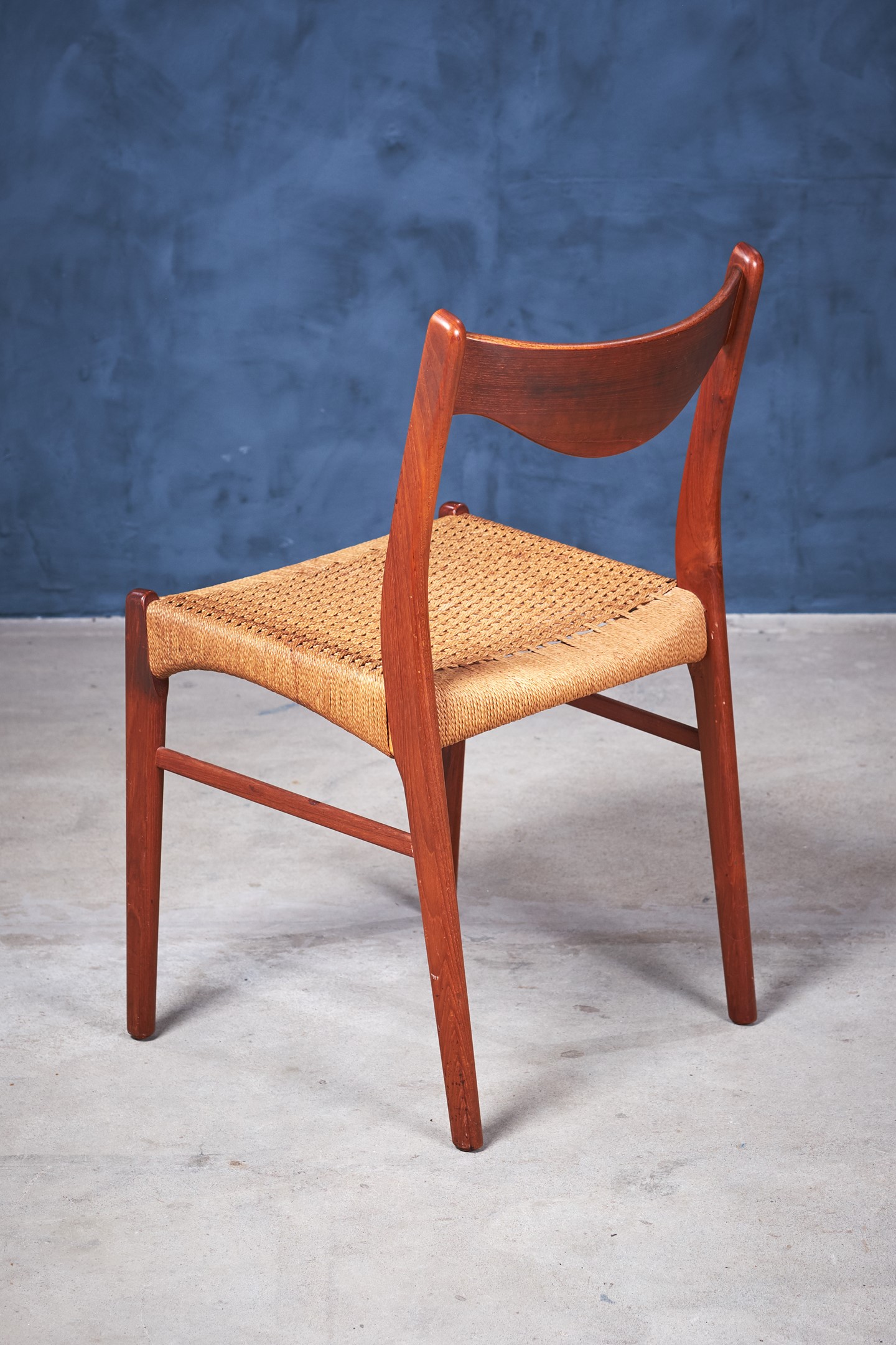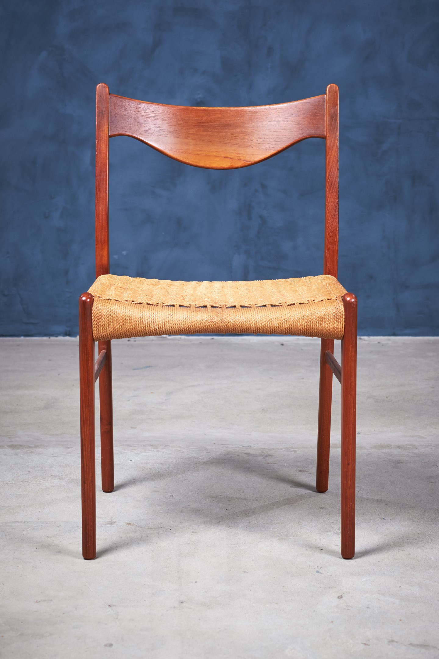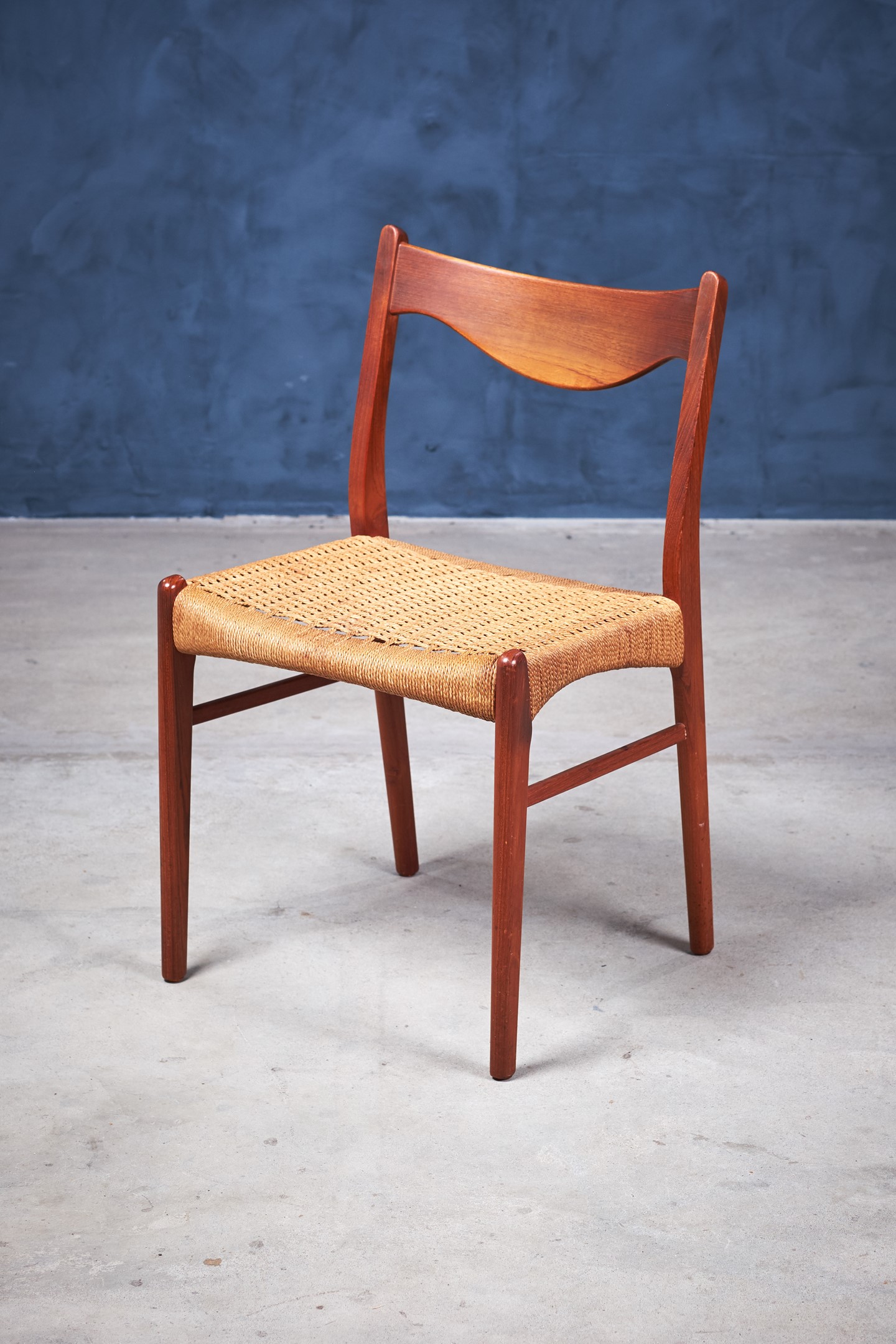 These chairs features solid teak frame with woven cord. The chairs are designed by Arne Wahl Iversen for Glyngøre Stolefabrik. These chairs have beautiful, refined details such as the curved seat sides and sculptural backrest.