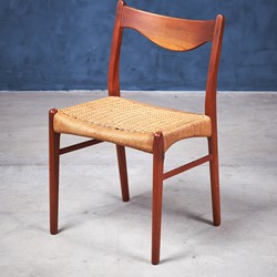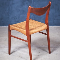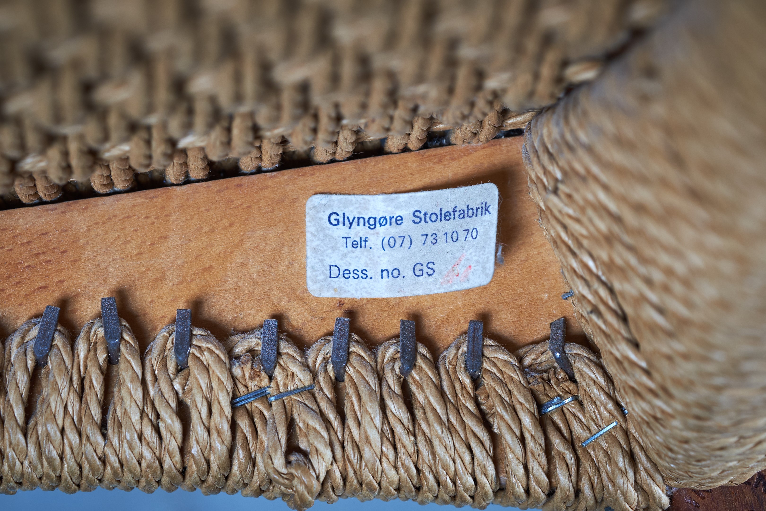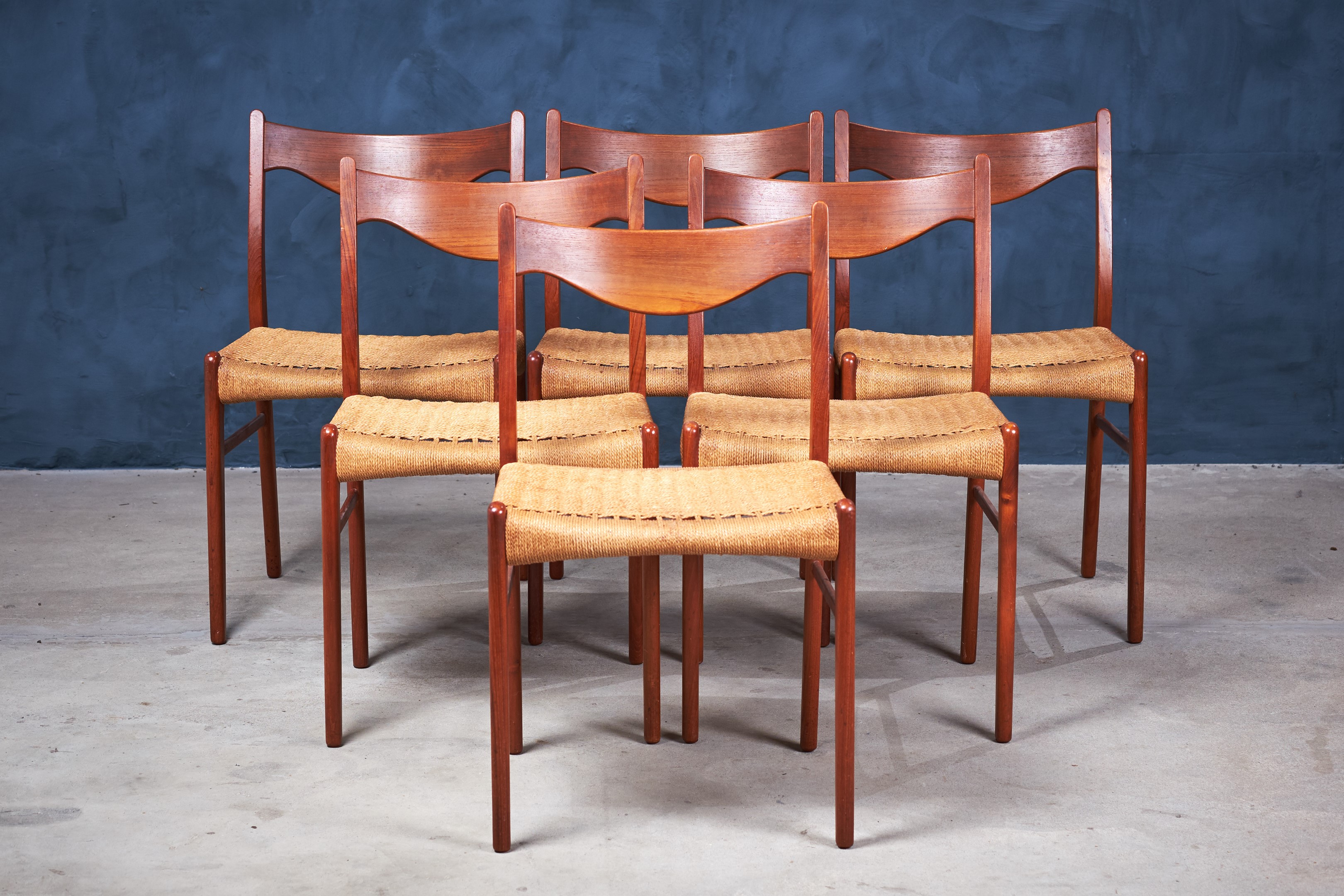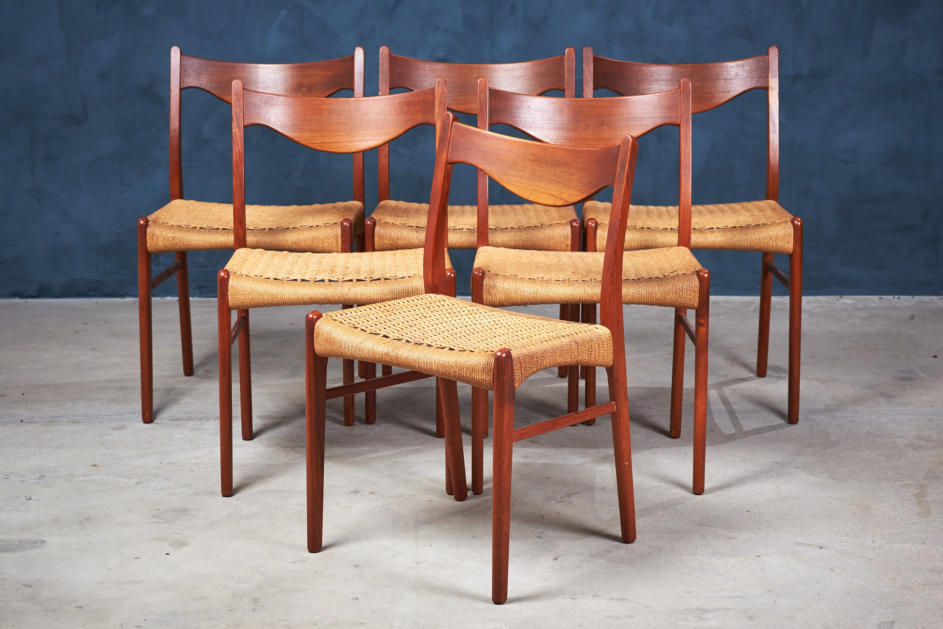 These chairs features solid teak frame with woven cord. The chairs are designed by Arne Wahl Iversen for Glyngøre Stolefabrik. These chairs have beautiful, refined details such as the curved seat sides and sculptural backrest.
