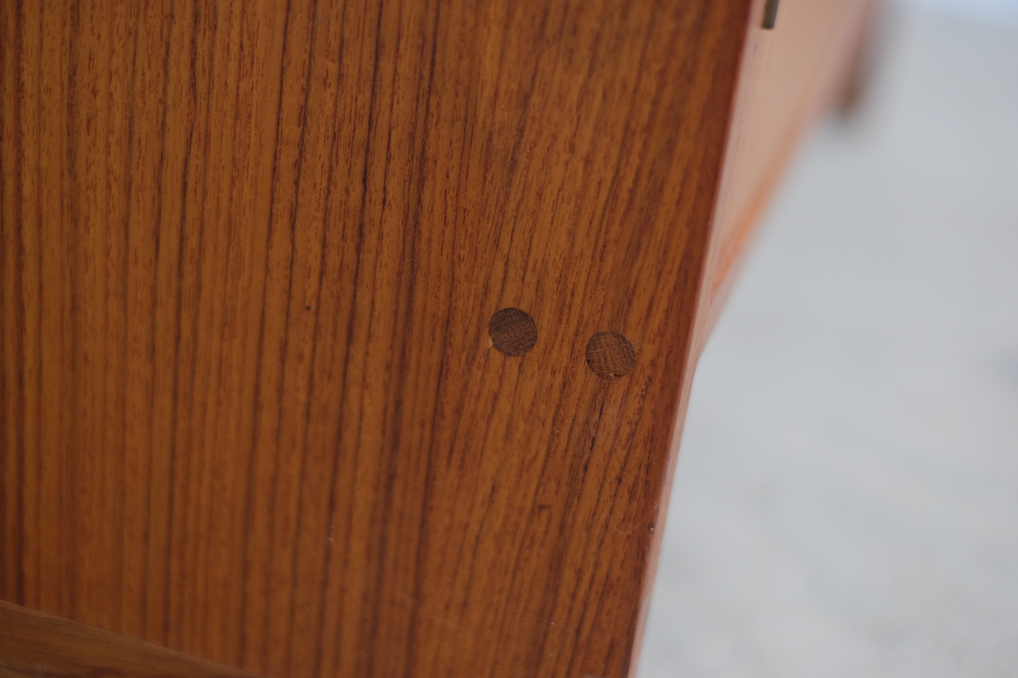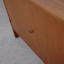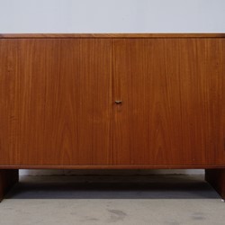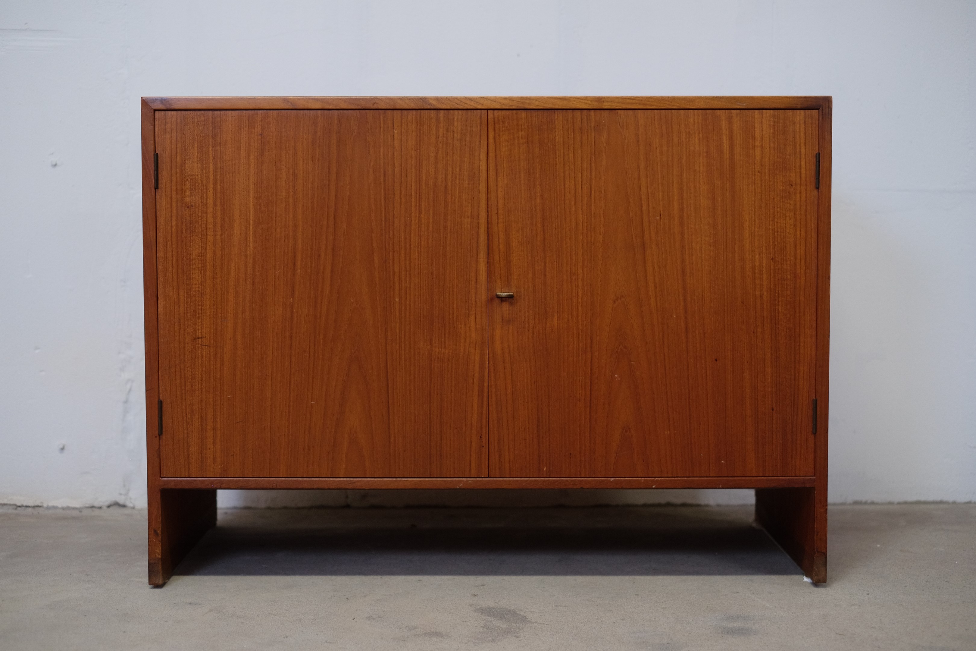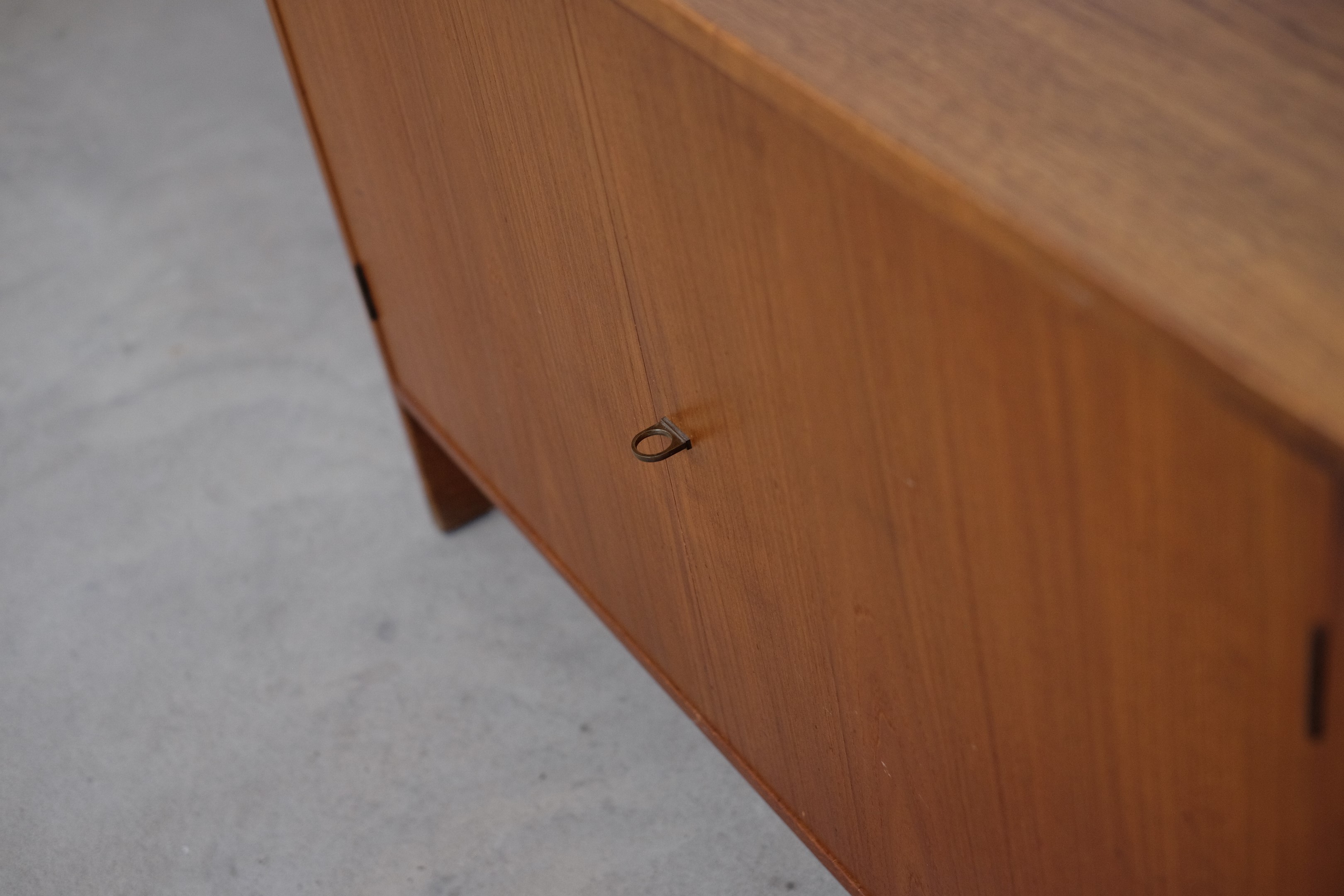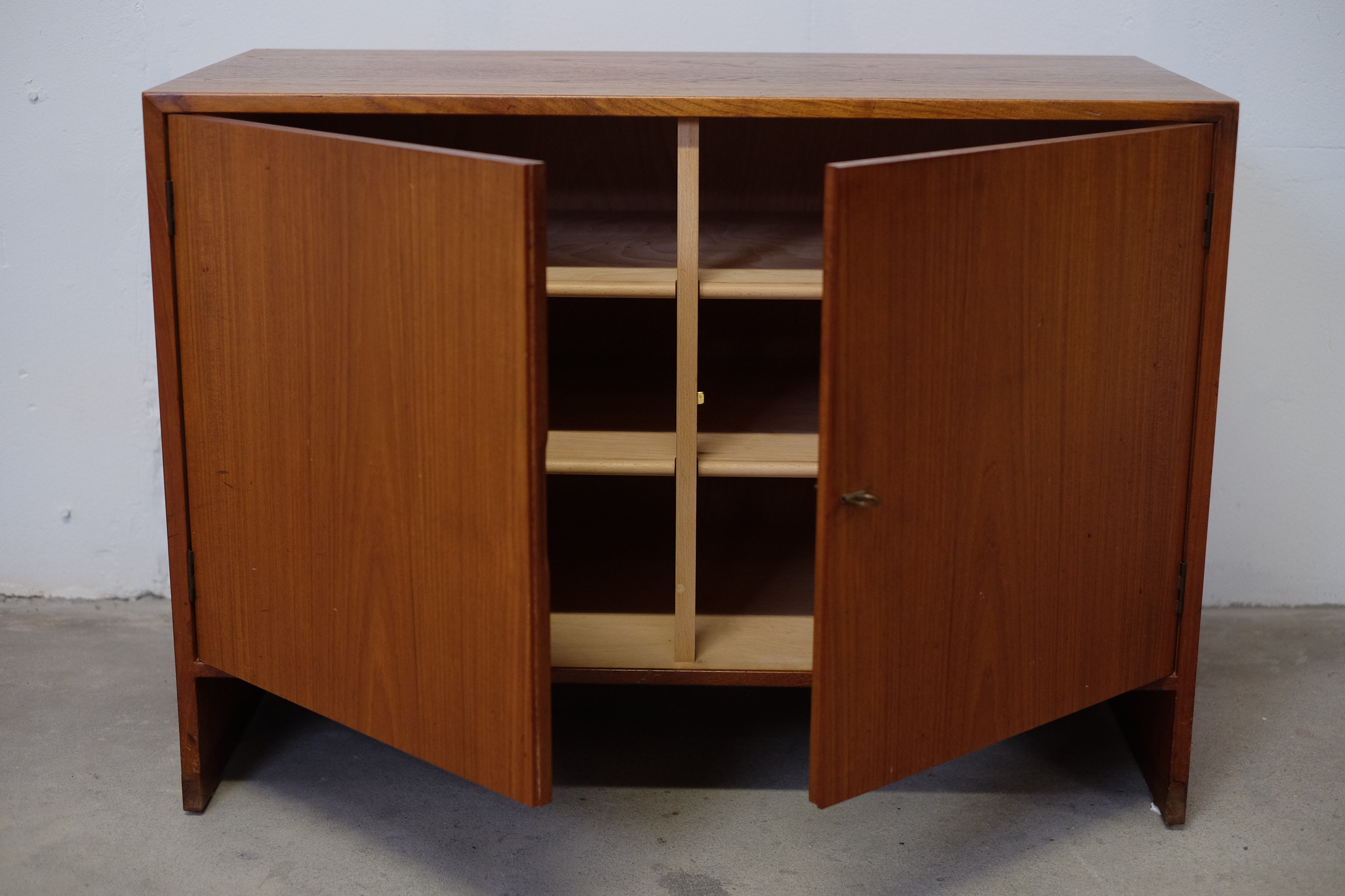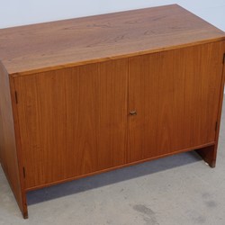 Teak sideboard or cabinet designed by Hans J. Wegner in 1956. The closet has two doors and four shelves with an elegant little brass handle to open. The furniture has a scratch here and there and a small chin or two, but nothing that does anything or interferes with the sight of the furniture. A nice patina after half a lifetime of use and still ready for at least half a lifetime more. And depending on the taste, there is always the opportunity to give it a new life if you like the authentic look (and that’s also one thing we can help with)