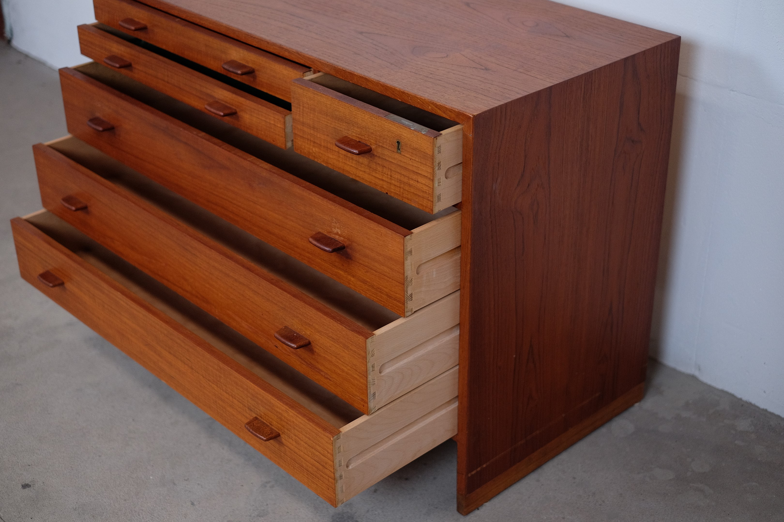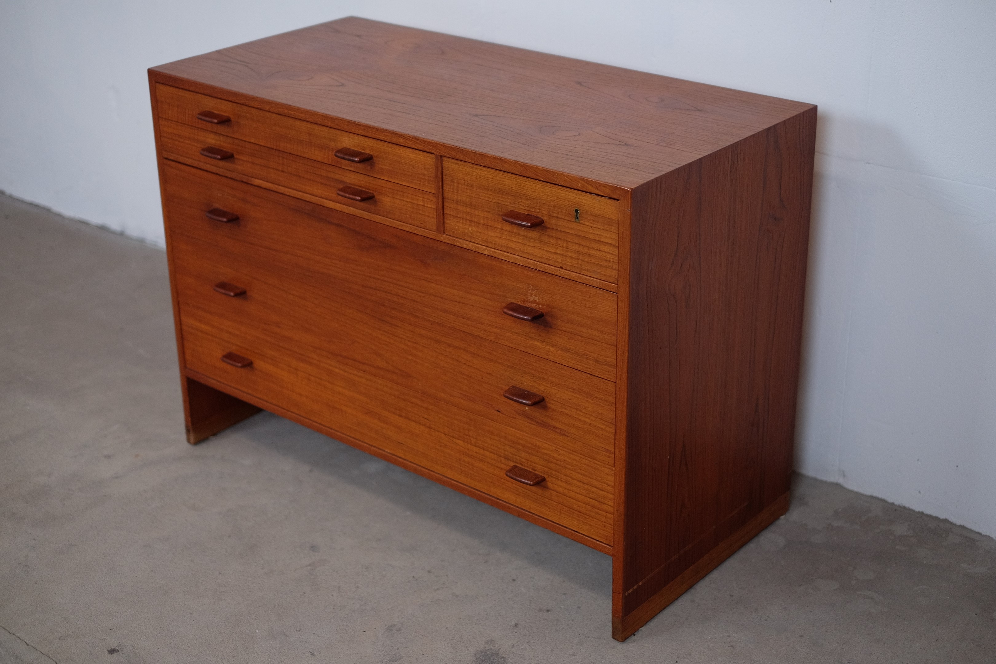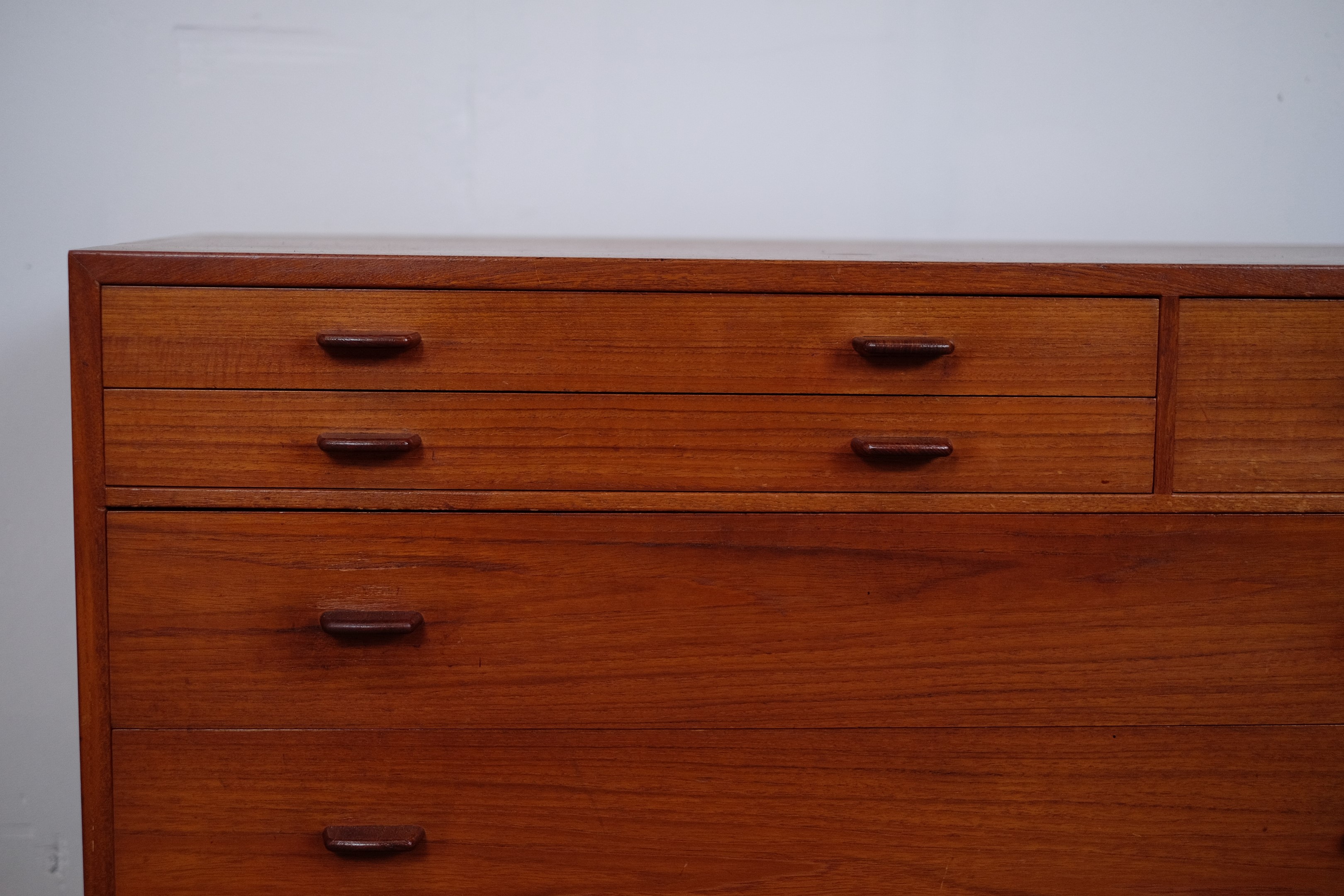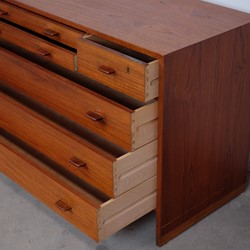 It's in it original condition, but can be completely restored if you wish. Some of our things are not restored, as some people prefer the originality and patina. But that is a matter of taste. We prefer that the buyer of the furniture decides himself. We have a carpenter who is ready to do it just the way you want it.Teak dresser model RY16 was designed by Hans J. Wegner in 1956 and produced by Ry Møbler in Denmark. This dresser is a beautiful example of Wegner's combination of functionality and simplicity, but with eye-catching craftsmanship and well-executed details. It's in it original condition, but can be completely restored if you wish. Some of our things are not restored, as some people prefer the originality and patina. But that is a matter of taste. We prefer that the buyer of the furniture decides himself. We have a carpenter who is ready to do it just the way you want it.