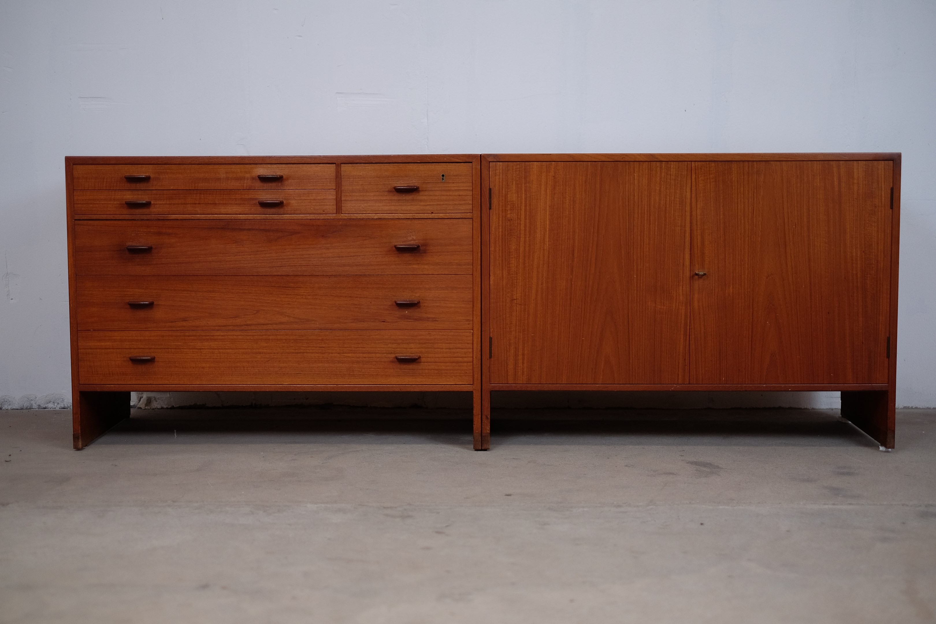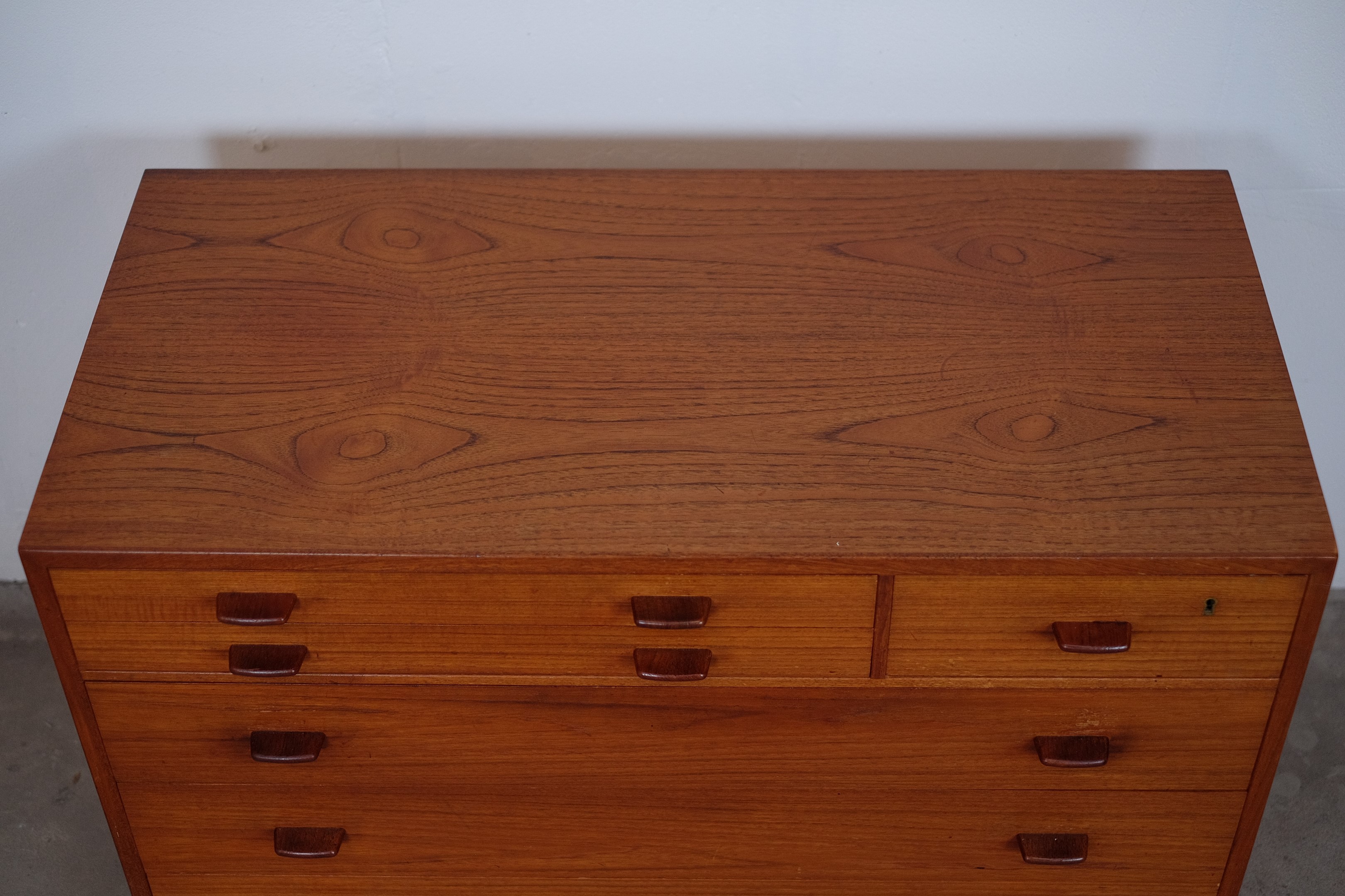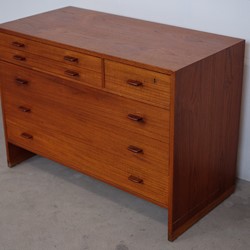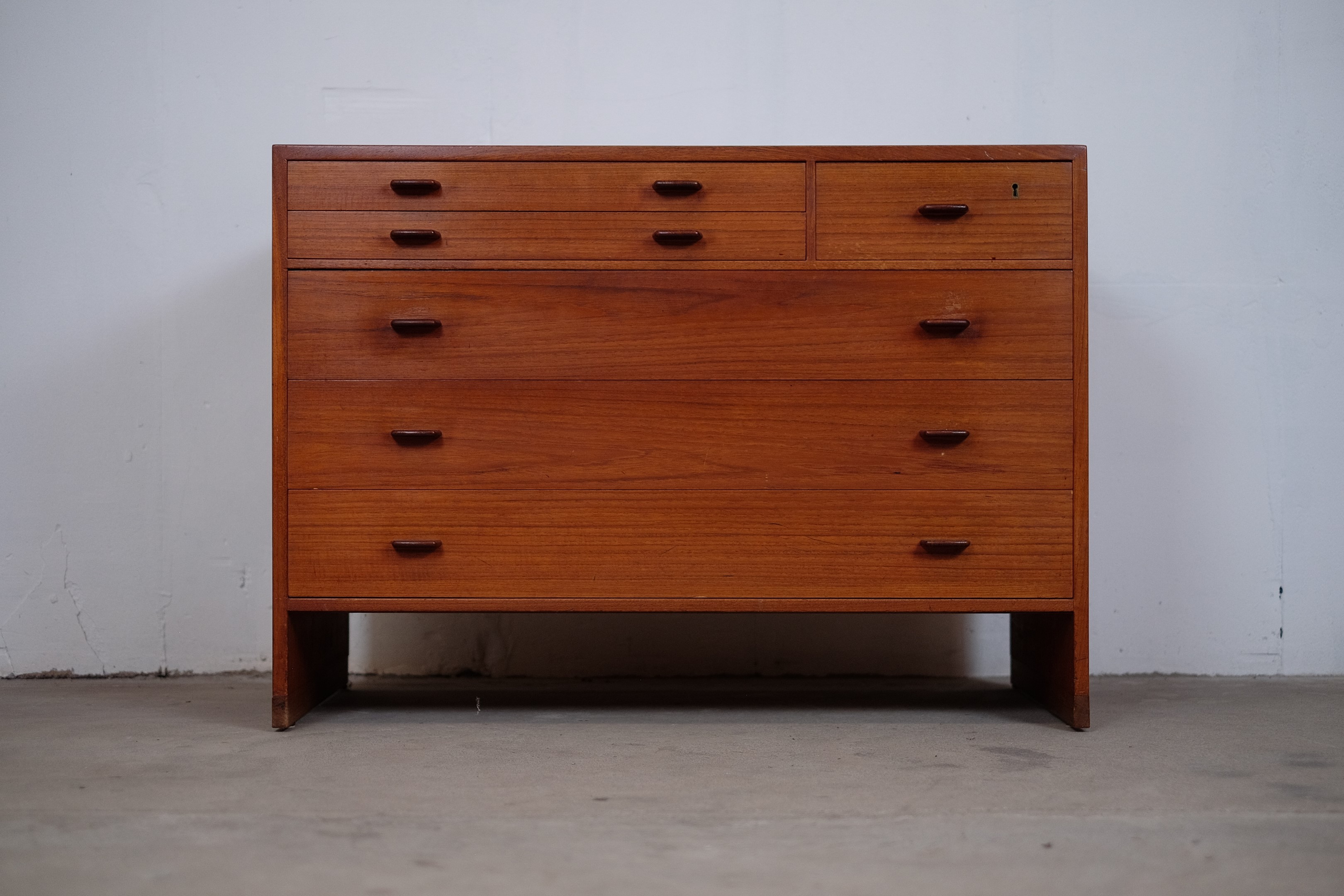 It's in it original condition, but can be completely restored if you wish. Some of our things are not restored, as some people prefer the originality and patina. But that is a matter of taste. We prefer that the buyer of the furniture decides himself. We have a carpenter who is ready to do it just the way you want it.Teak dresser model RY16 was designed by Hans J. Wegner in 1956 and produced by Ry Møbler in Denmark. This dresser is a beautiful example of Wegner's combination of functionality and simplicity, but with eye-catching craftsmanship and well-executed details. It's in it original condition, but can be completely restored if you wish. Some of our things are not restored, as some people prefer the originality and patina. But that is a matter of taste. We prefer that the buyer of the furniture decides himself. We have a carpenter who is ready to do it just the way you want it.
