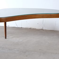 Organic shaped coffee table in nut tree with glass top and brass shoes.