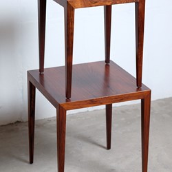 Gorgeous pair of nesting tables in rosewood with beautiful grains. True to most of Hansen's pieces, this design features his hallmark triangular joints which are so flawlessly executed. The legs and solid rosewood. This piece would be a unique addition to any modern environment.