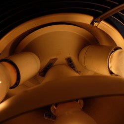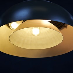Grey lacquered metal shade with a white lacquered inner shade that diffuses the light and makes it very suitable above a dining table. It provides a great light.
