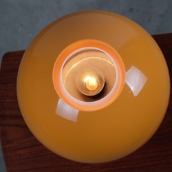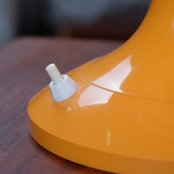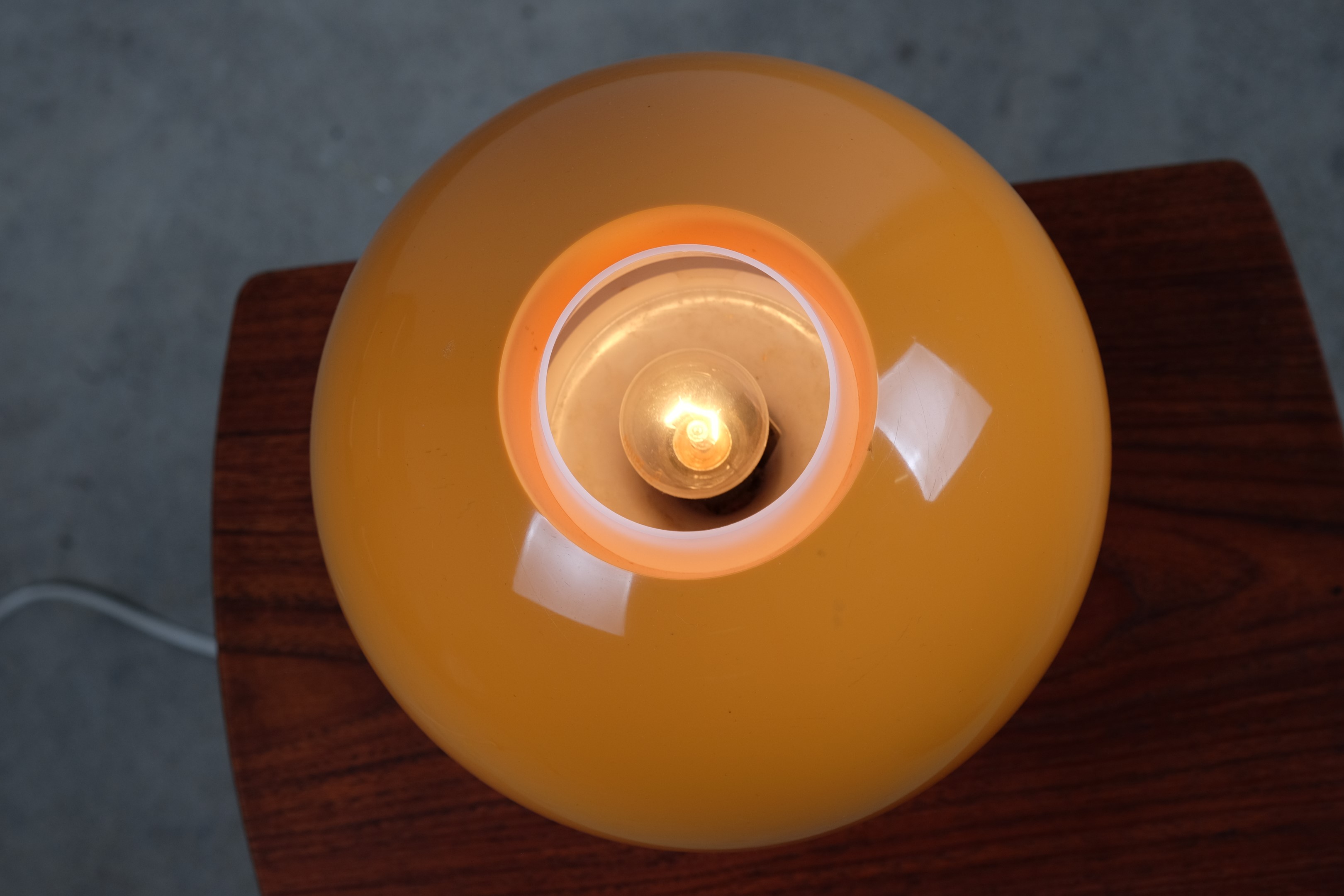 Just look at this beauty! One of Bent Karlby's spaceage lamps that has hit the timeless design and almost fits in everywhere. With its fungus-shaped shape and round screen, it sheds a comfortable and cozy light. The beautiful orange color appears when the bulb is on and you can see the light through the screen. Fantastic lamp of a fantastic designer! Diameter 25cm
