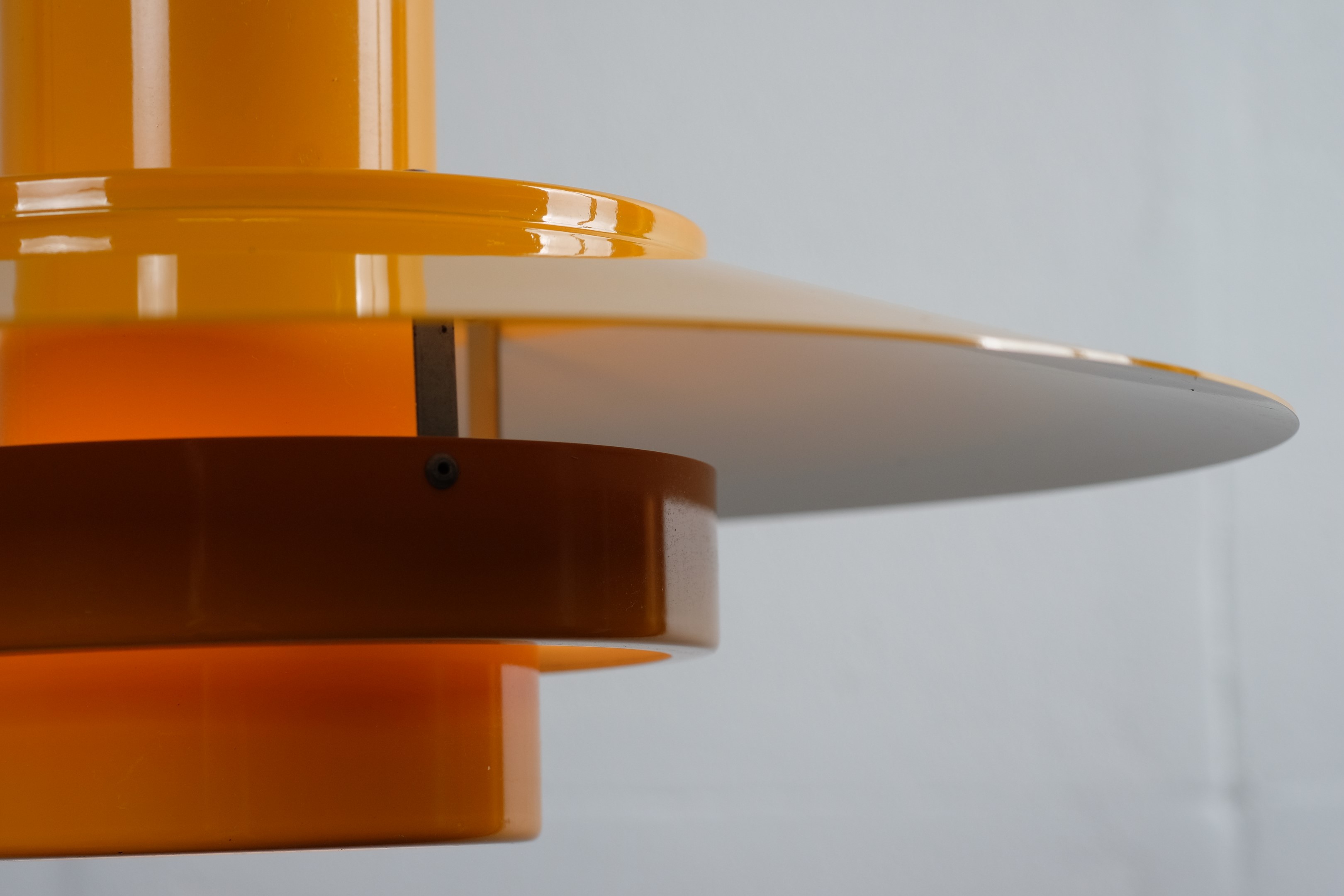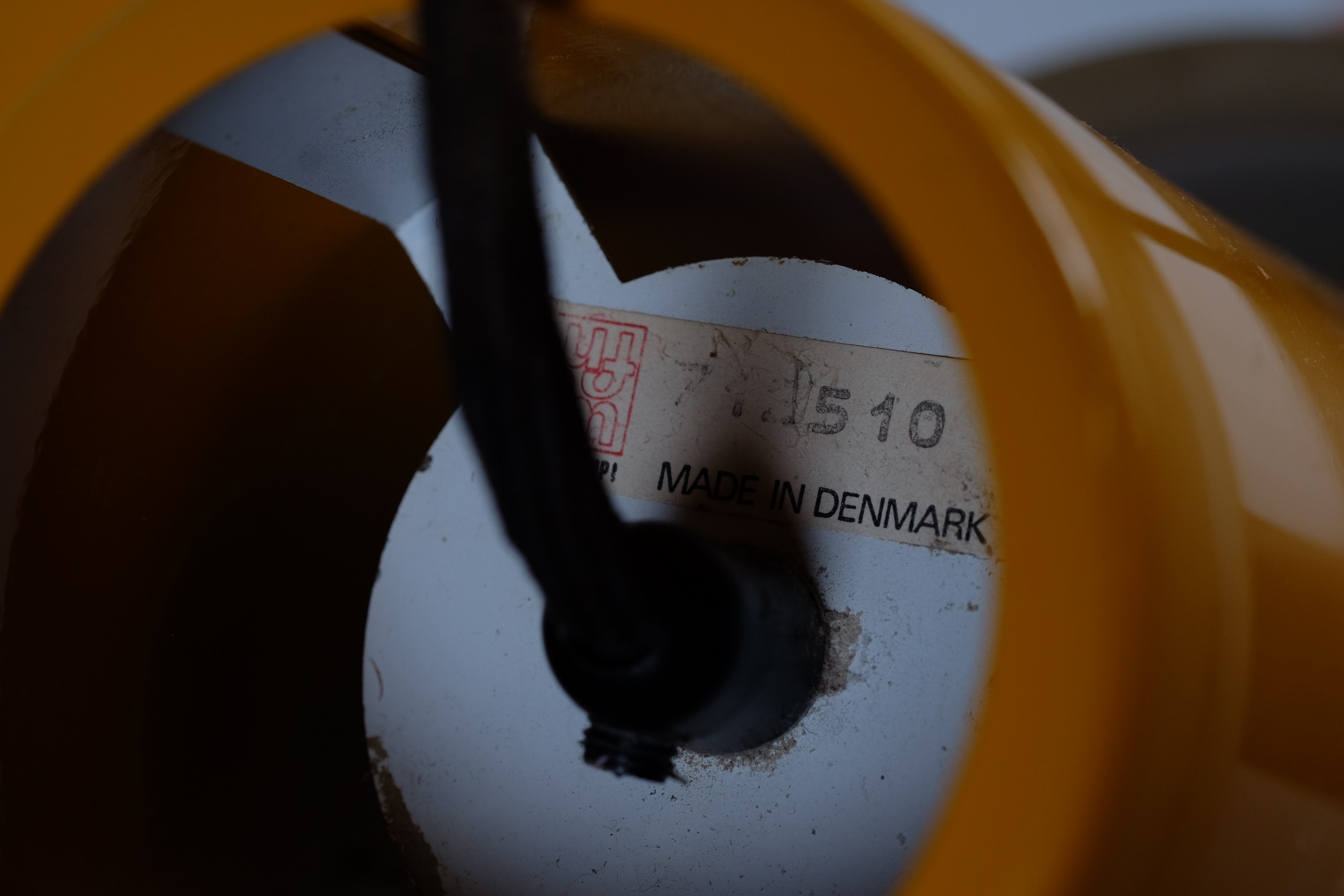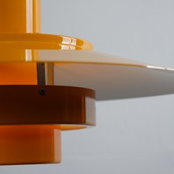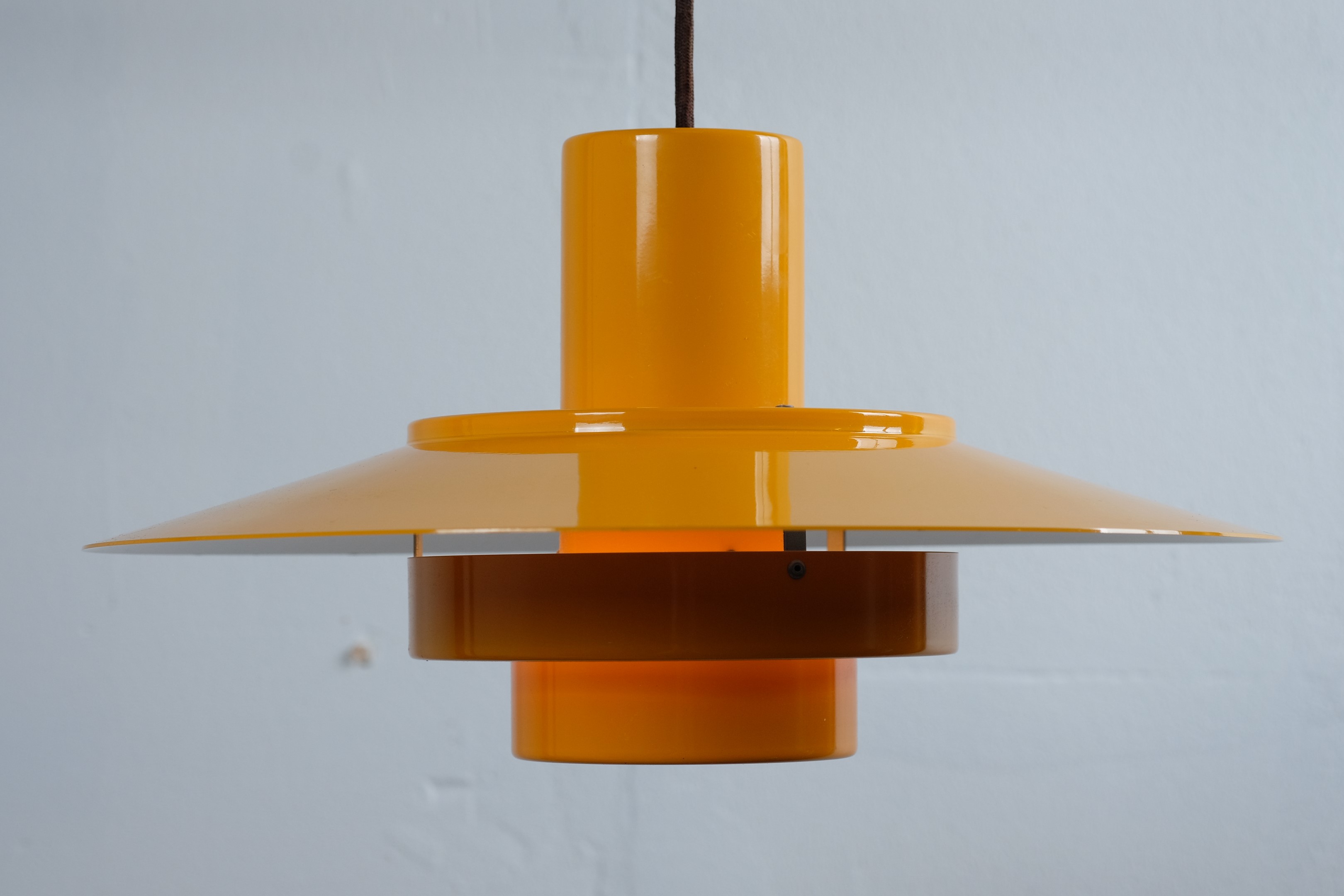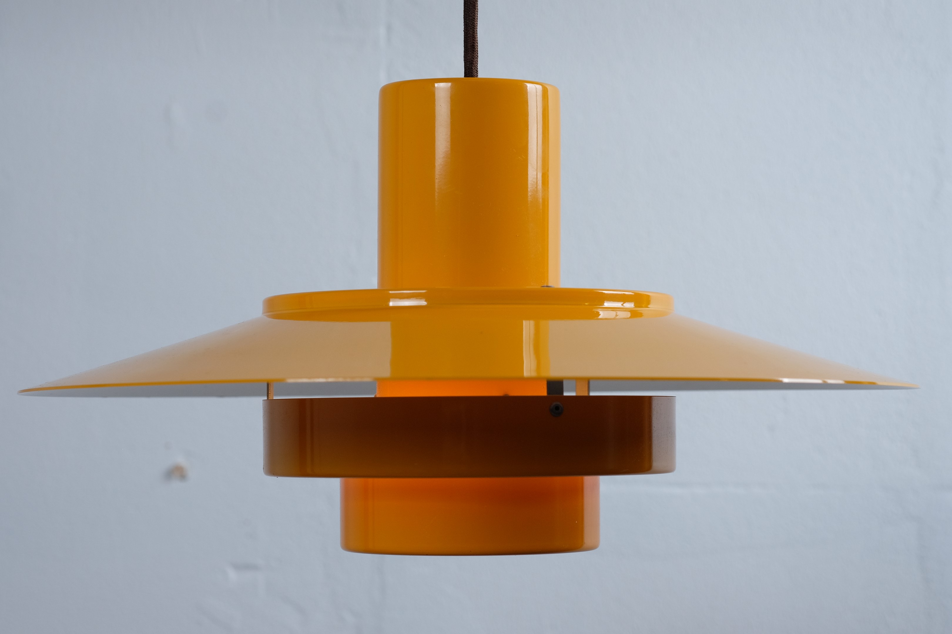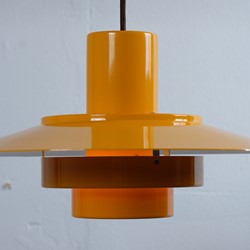 A dark yellow lamp, with some beautiful shapes. Very styled and classic design, which Fog & Mørup has to be known for and of course their ways to make lamps that provided great light. The lamp is useful as a dining table lamp but can easily decorate an empty corner and just hang for itself.