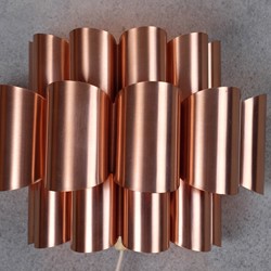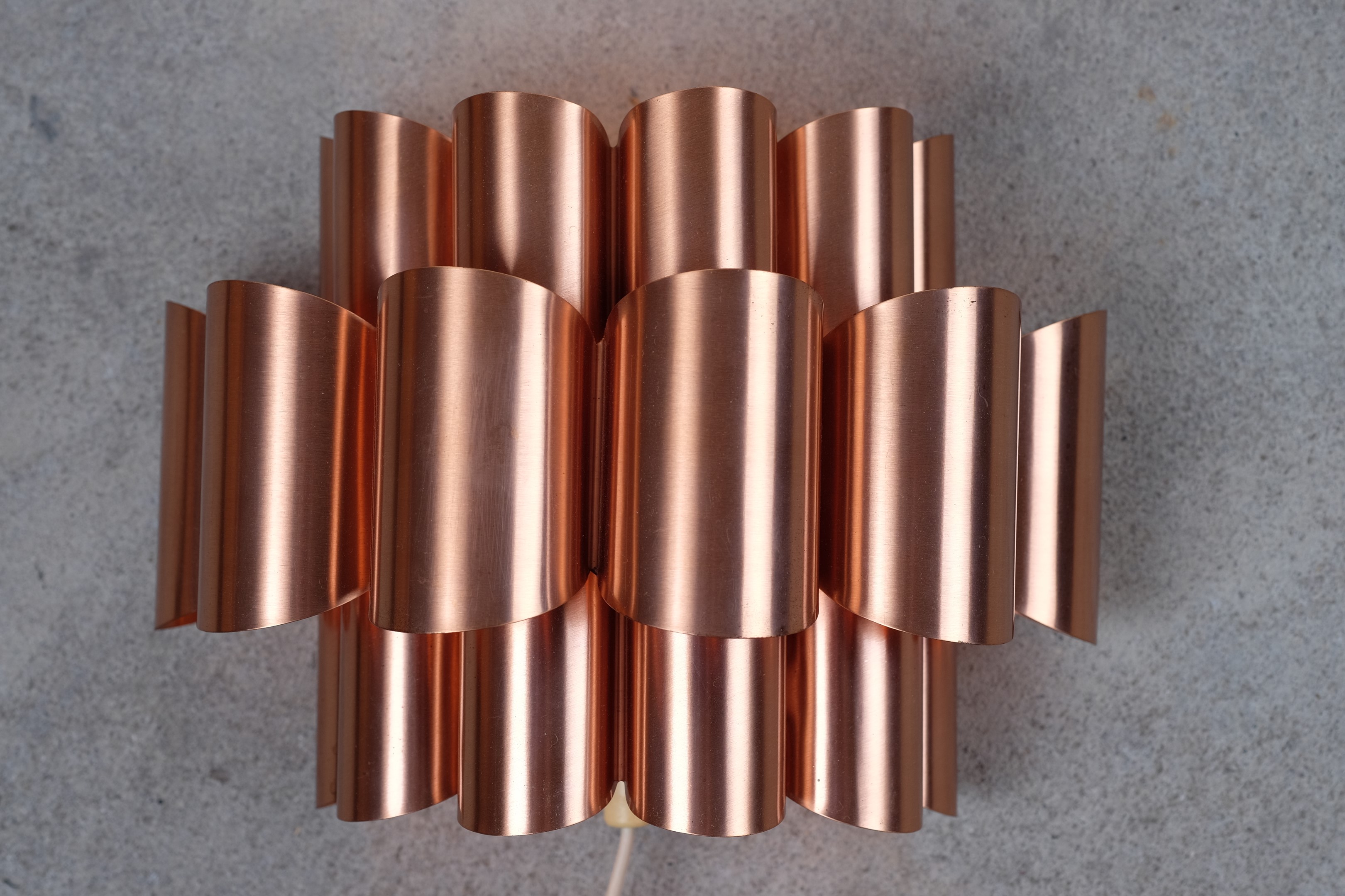 This beautiful wall lamp, designed by Werner Schou, is made of copper and in very good vintage condition. The wave formed structure in the lamp provides a great light.