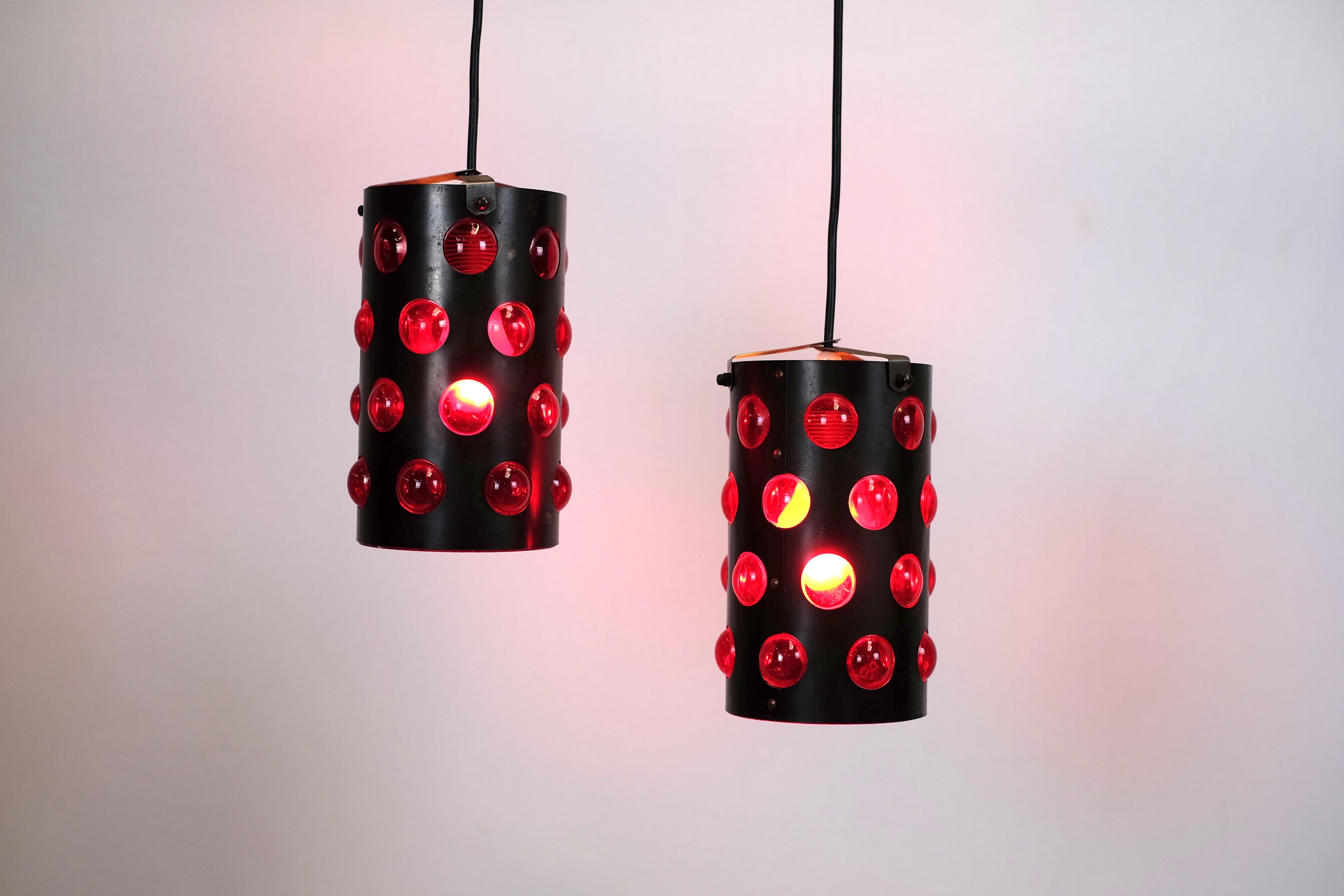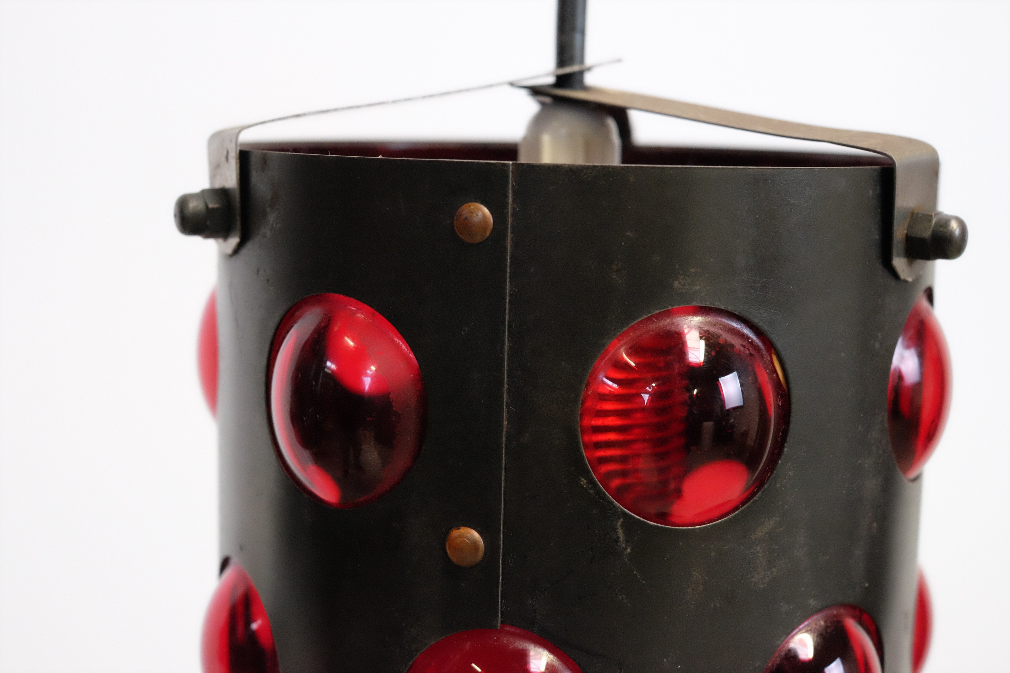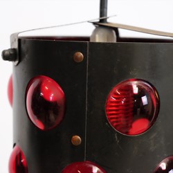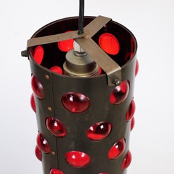 Cylinder shaped lamp with bubbles of red plastic that provides a cozy light.