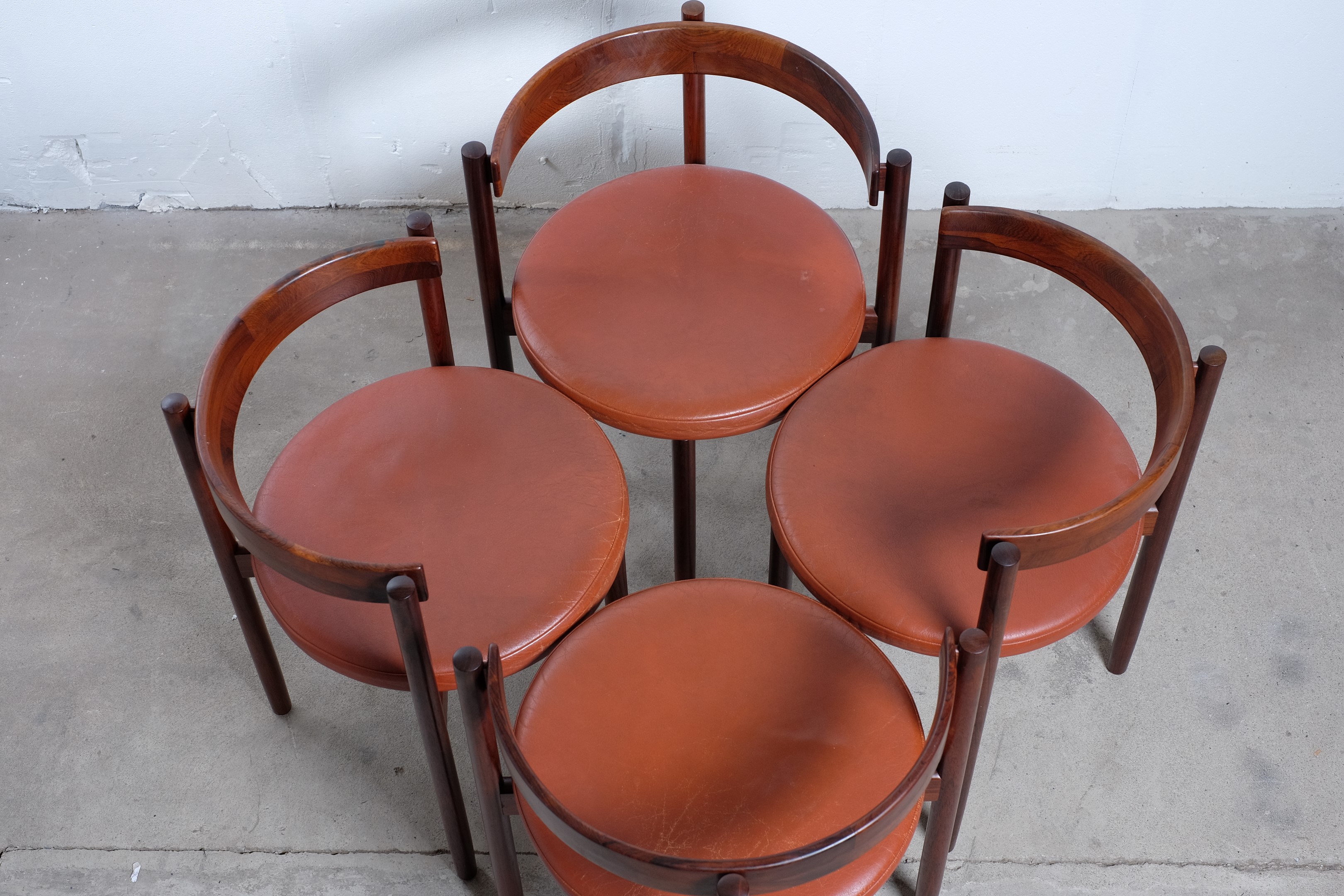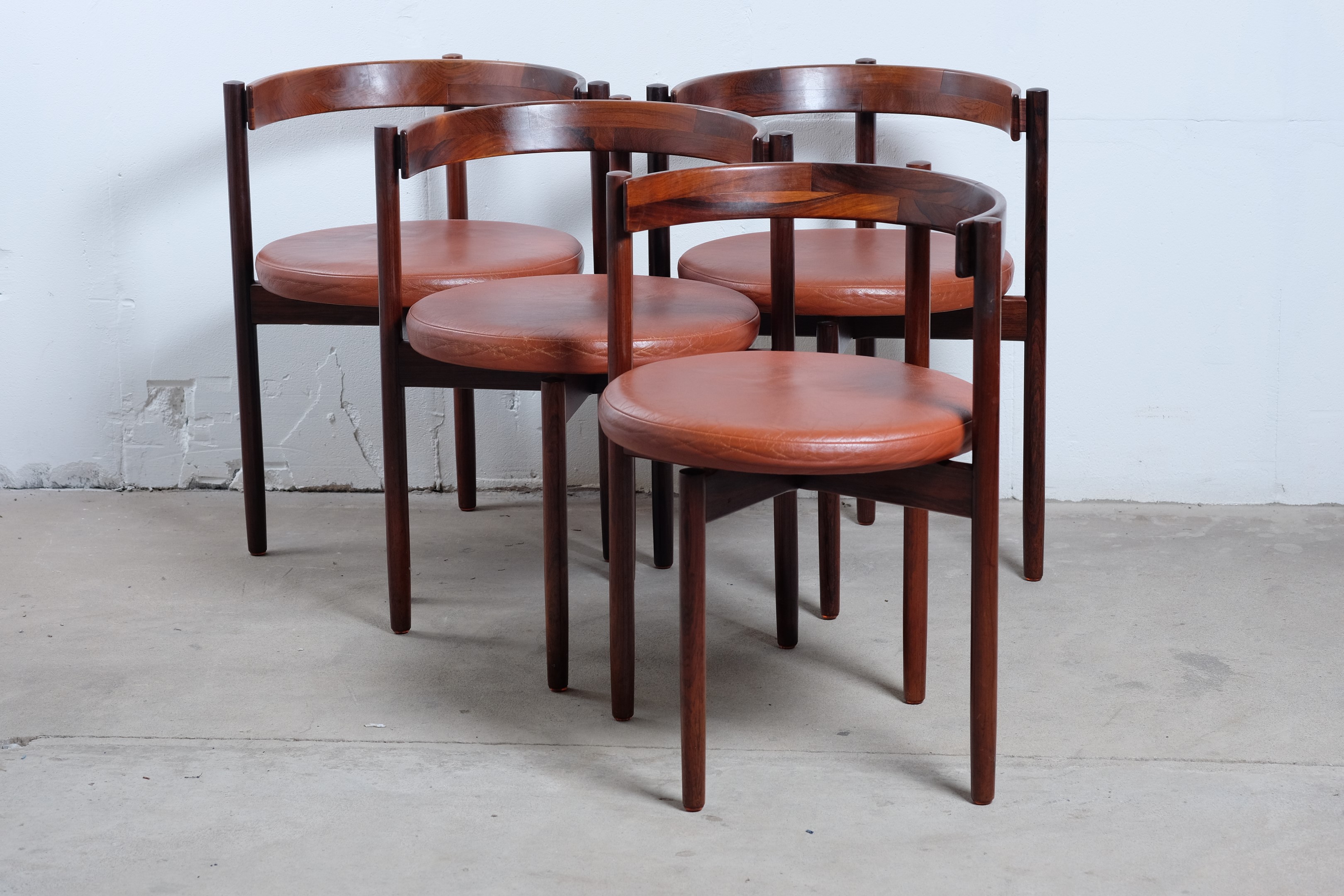 Stunning and rare set of four Hugo Frandsen armchairs in rosewood. Look at the woodwork and details! One of the Danish mid-century classics. This rare round back chair was designed by Dane Hugo Frandsen in 1964 and manufactured by Børge M. Søndergaard in the mid-1960s. It is stamped with the Danish Furniture Makers Control stamp beneath the seat.
