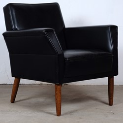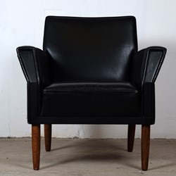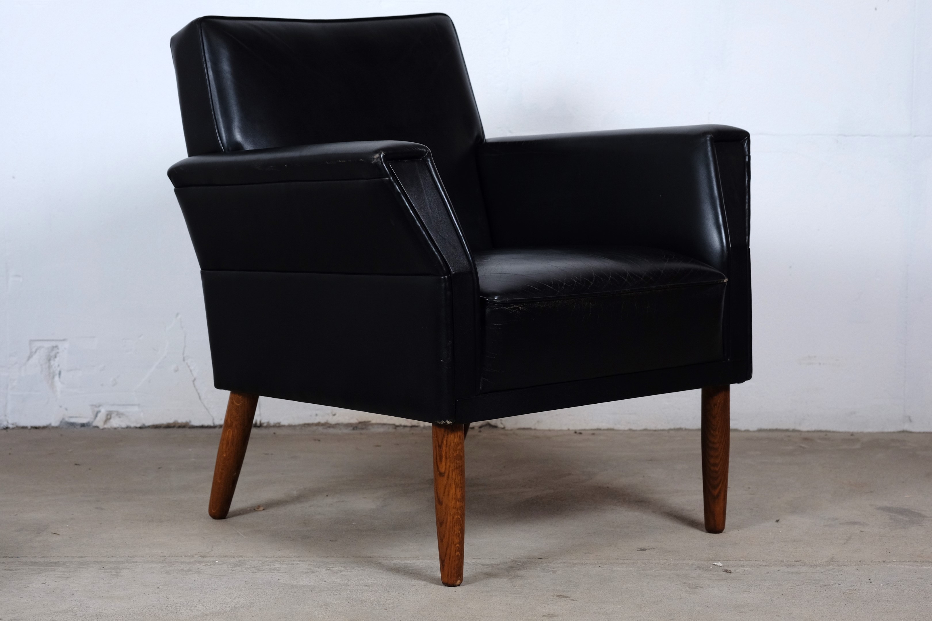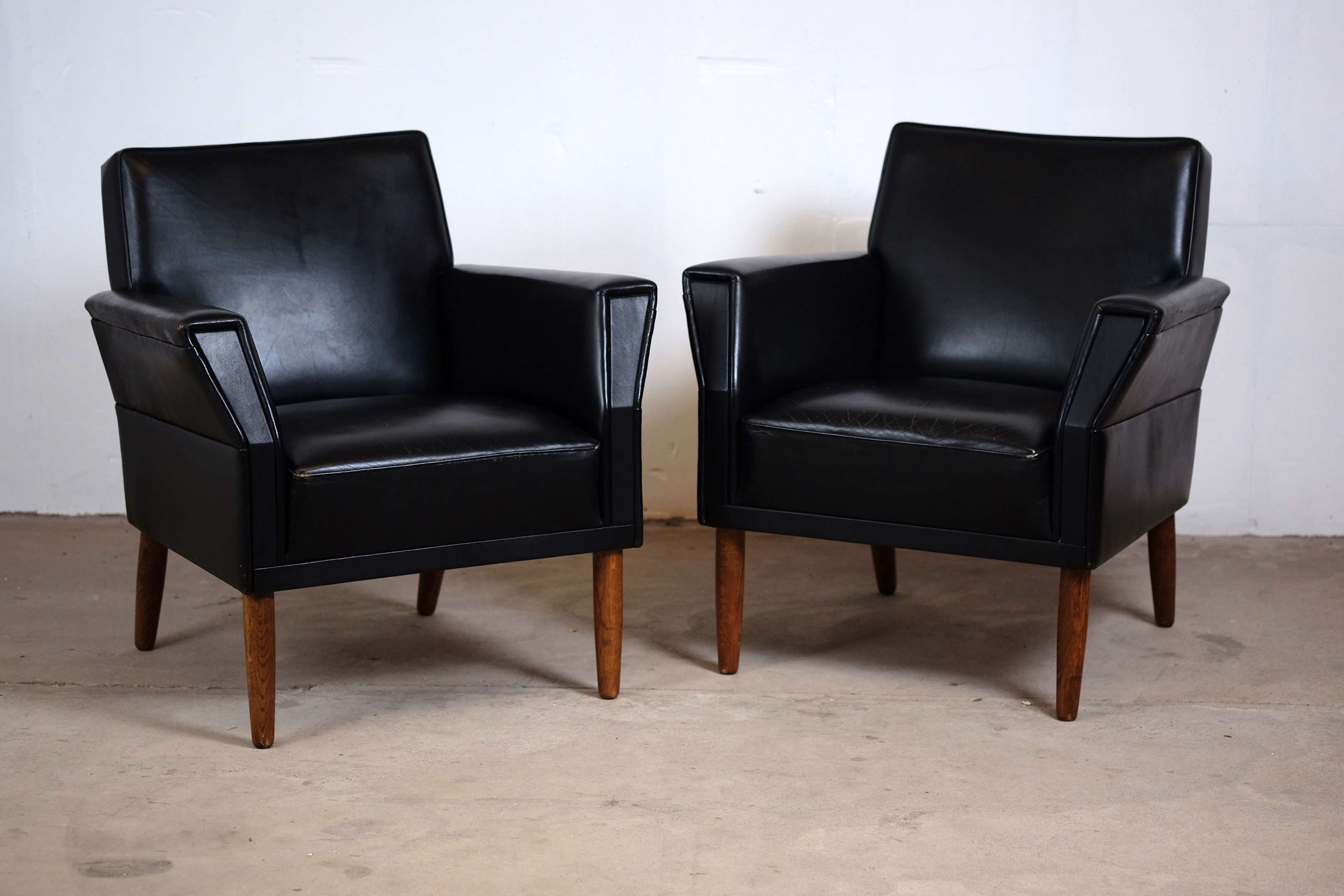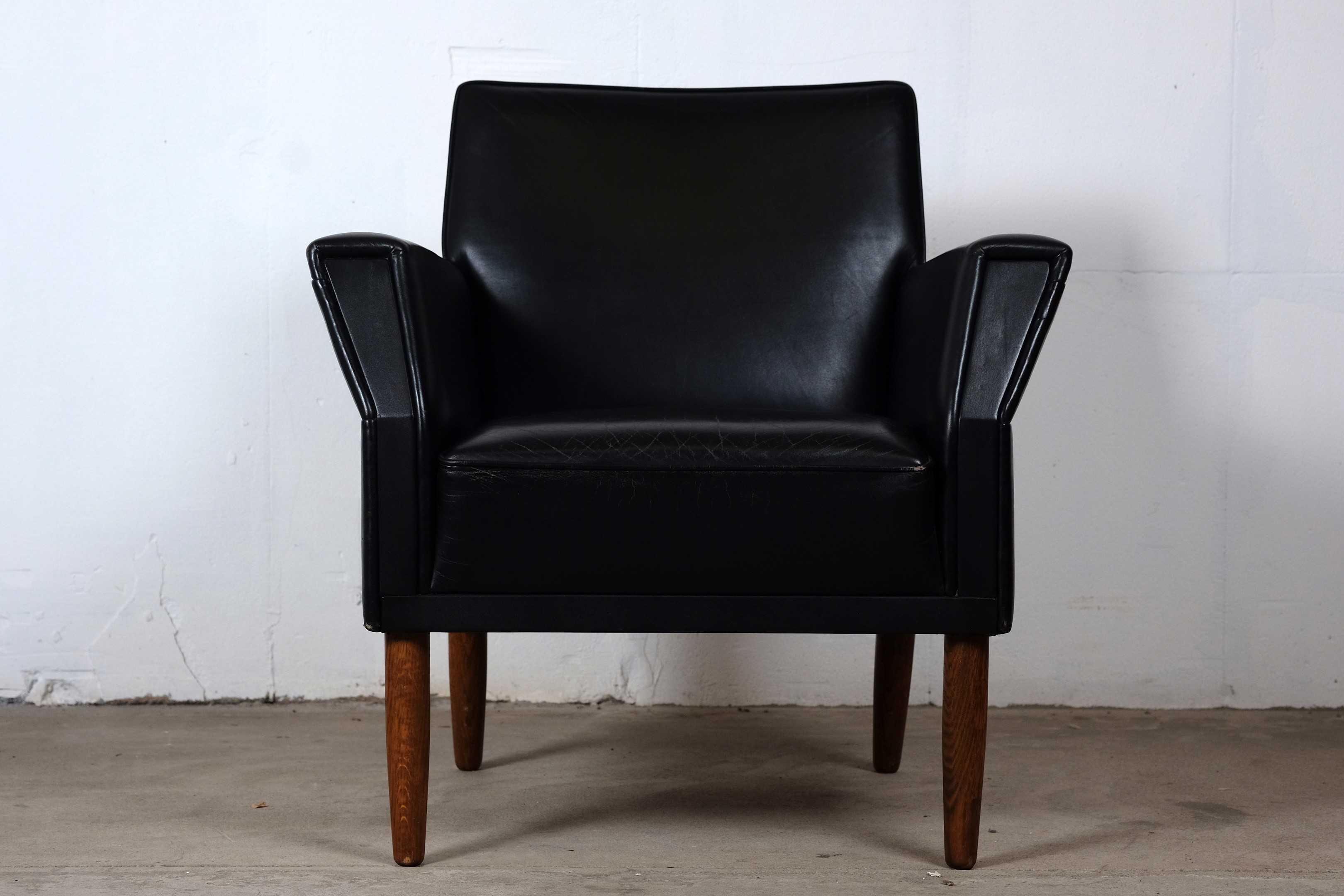 Stunning pair of easy chairs in black leather with solid legs in stained oak.