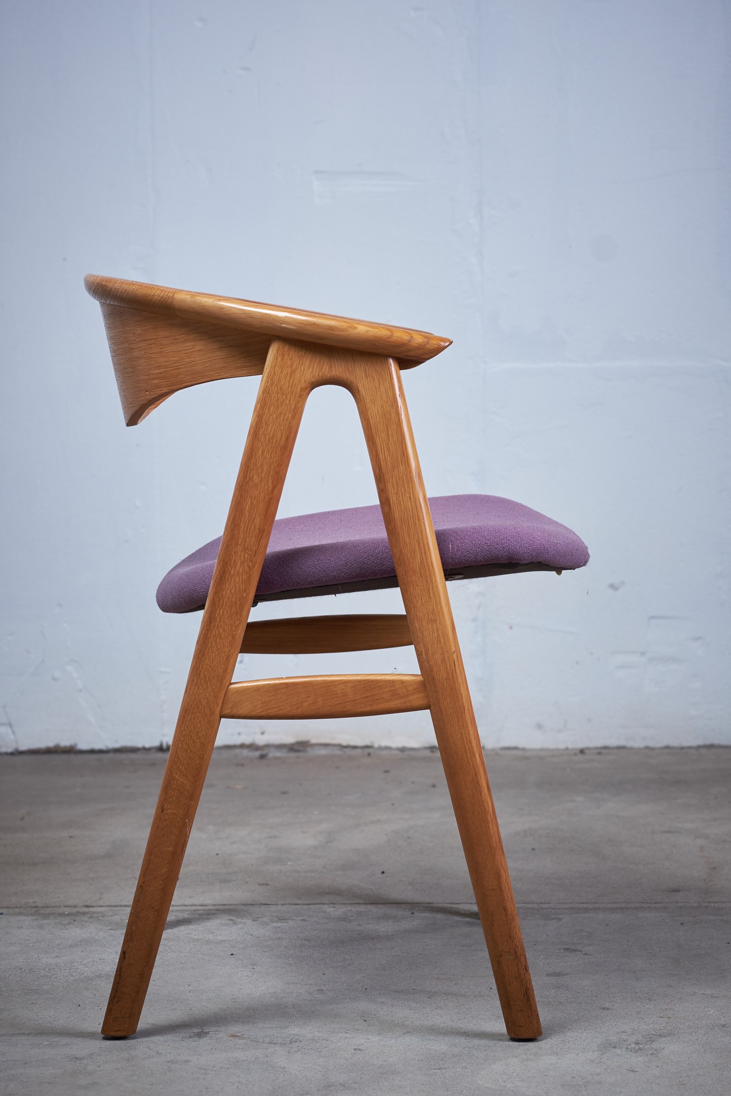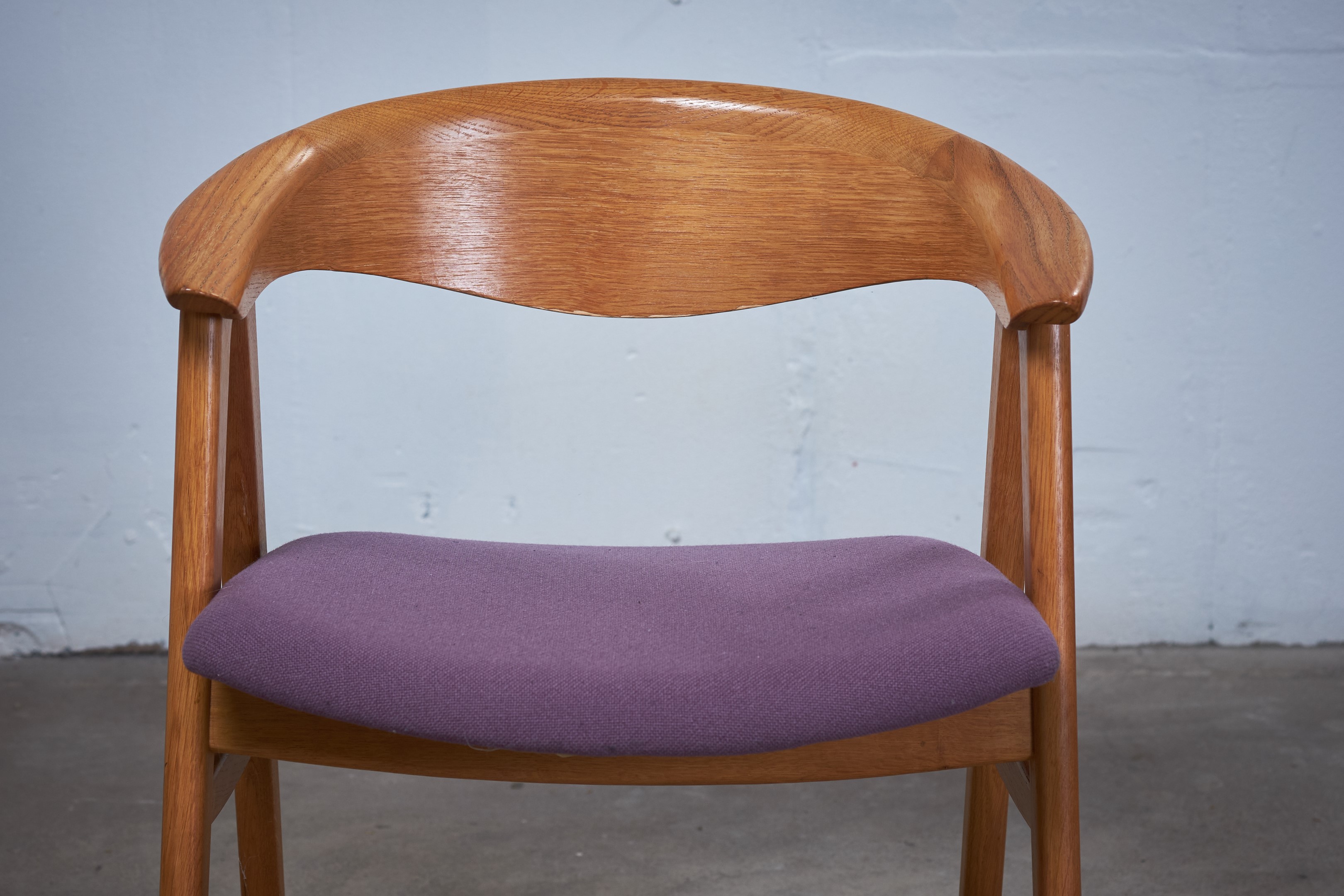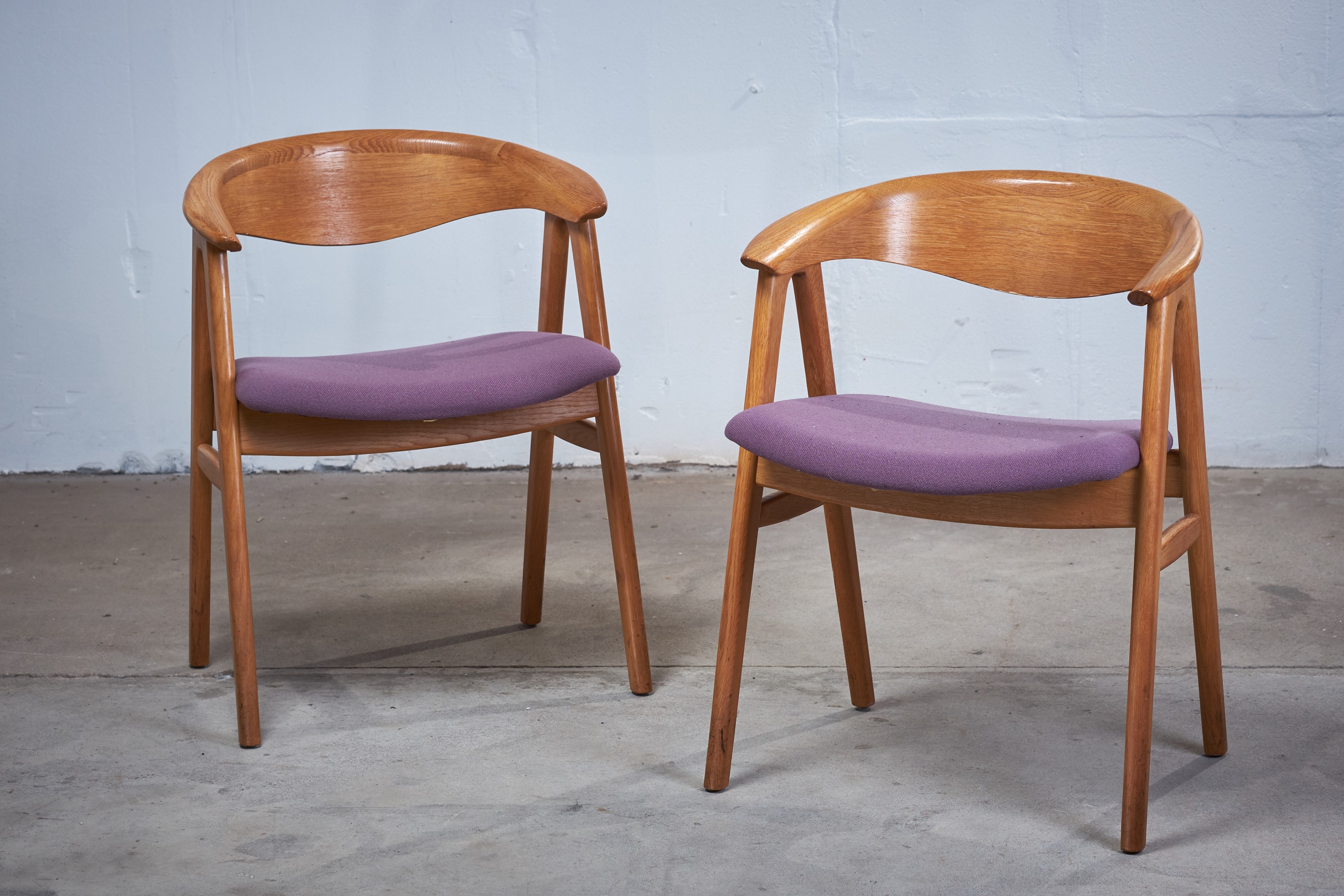 This pair of Erik Kirkegaard armchairs in oak was designed in 1952, 'Model 52' for Høng Stolefabrik. The chairs has a generous, curved backrest with a wide lip and a seat with good quality wool, supported between two A-frame legs of solid oak. The seat falls backwards, which gives a great comfort when sitting in the chair.