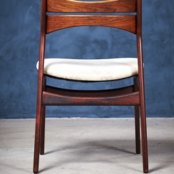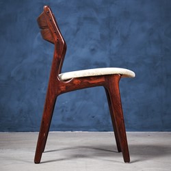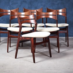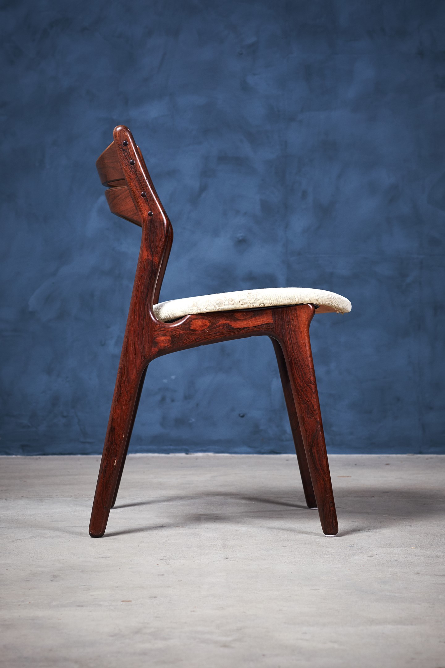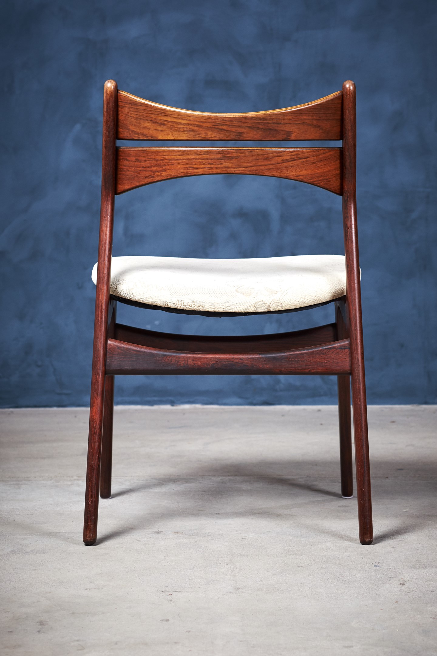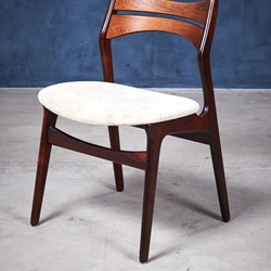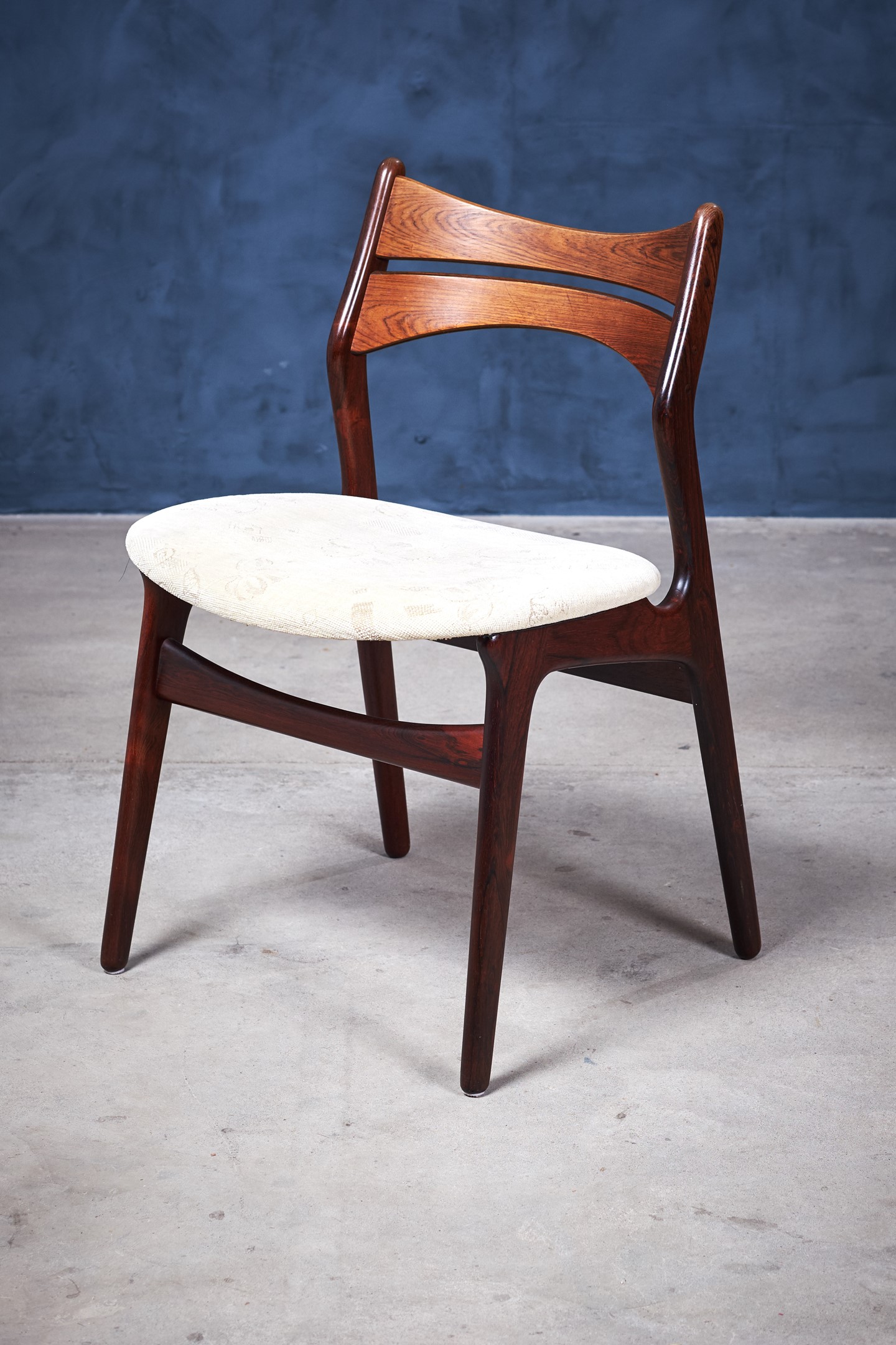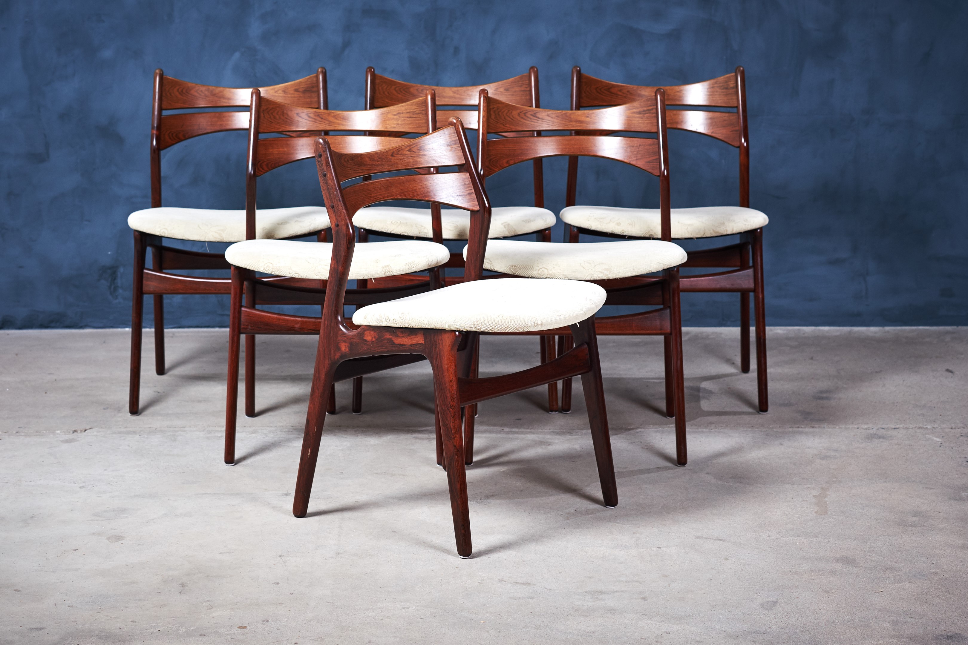 A set of six Rosewood dining chairs Model 310 by Erik Buch and produced at Christian Christensens Møbelfabrik - gently restored, in really good original vintage condition. Elegant with soft, organic lines and the curvature of the rosewood backrest and the rosewood frame supports the human body perfectly, making it an extremely comfortable dining chair. It would add style and class to any dining room.The Model 310 chair is a beautiful example from the Danish modern era, constructed of solid rosewood frame with curved rosewood backrest and floating seat.