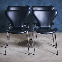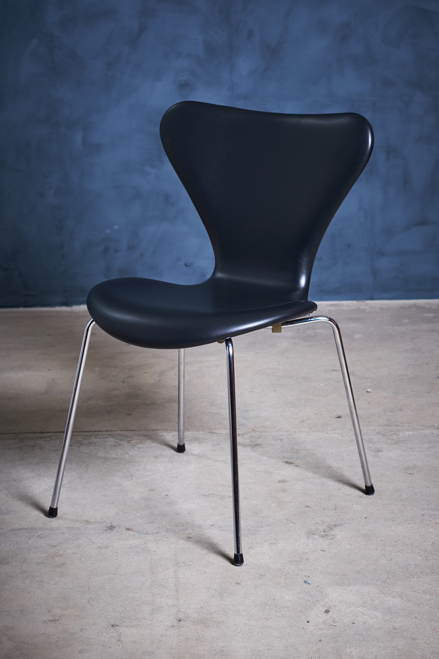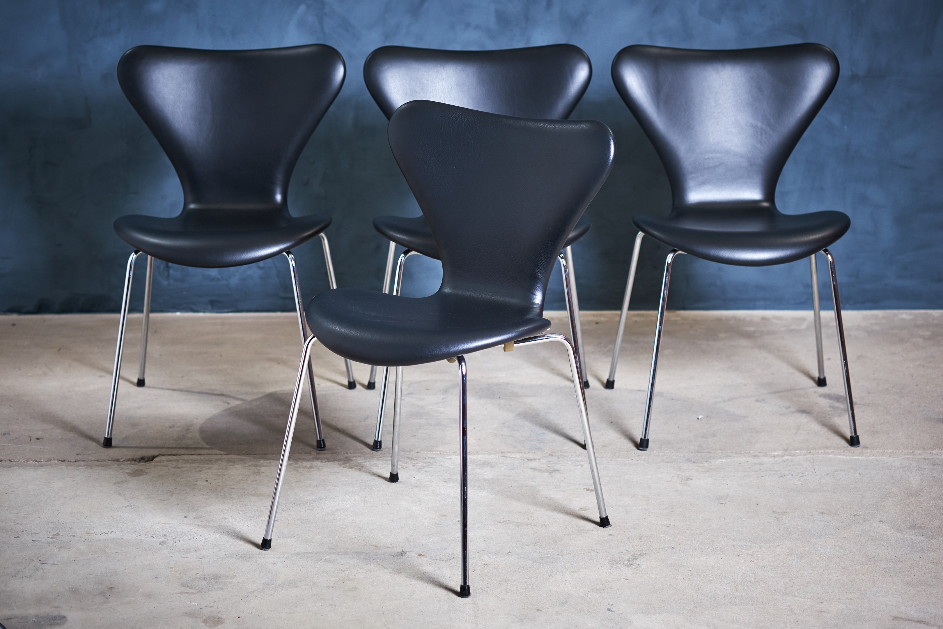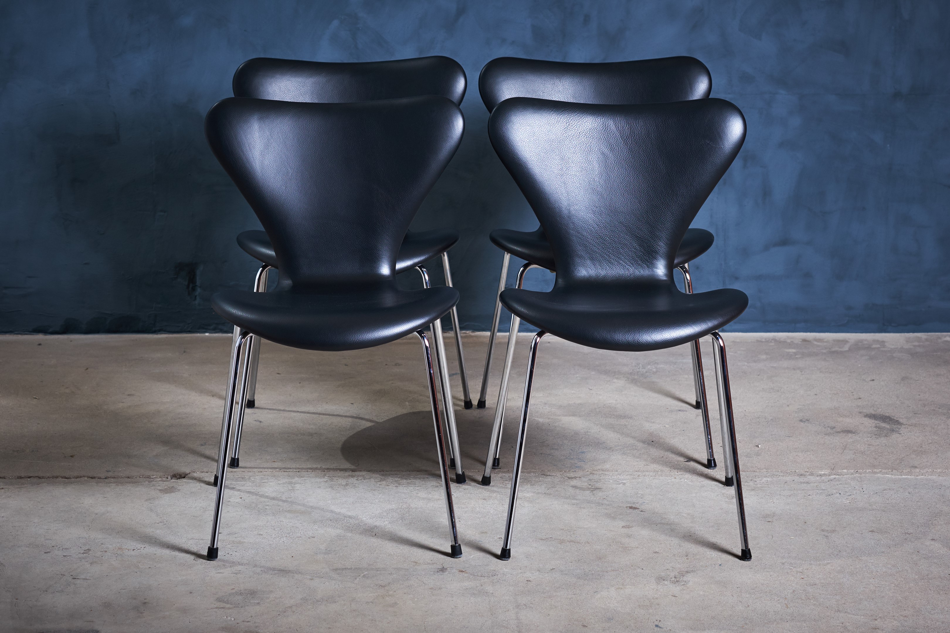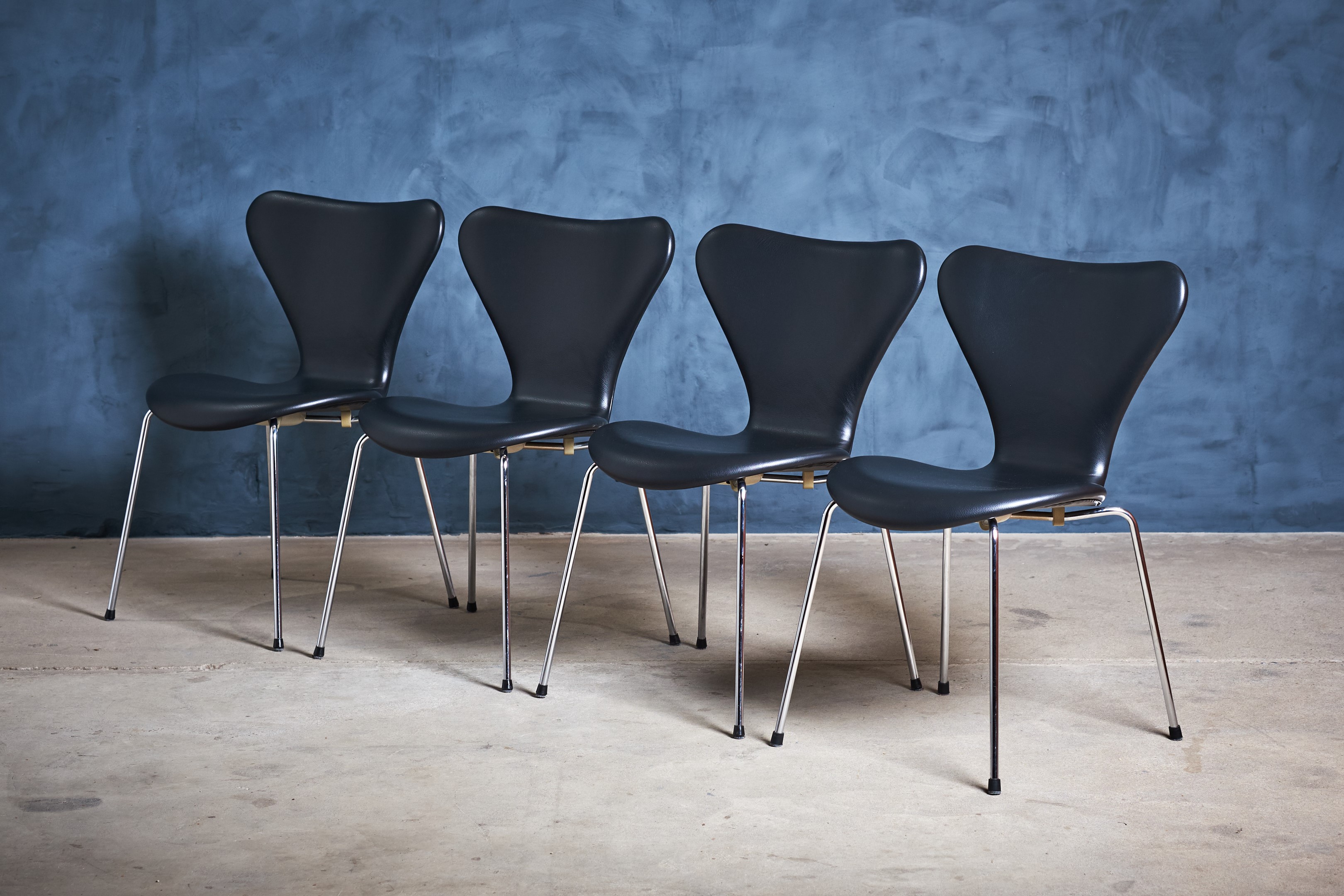 A set of four Seven chairs, model 3107, designed by Arne Jacobsen and manufactured by Fritz Hansen in the 1980s. The chairs are upholstered in black classic leather. Danish design by Arne Jacobsen at his best! We can upholster more chairs if needed, in any leather wanted.