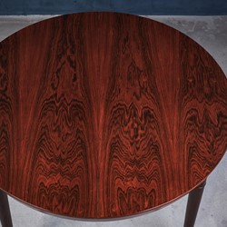 Round dining table in rosewood with two leafs for extension. Designed by the Danish designer Severin Hansen. The table has been totally renovated and got new lacquer by a professionel carpenter. Amazing grains in the rosewood which gives a fantastic look. This table would fit in any modern environment.