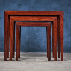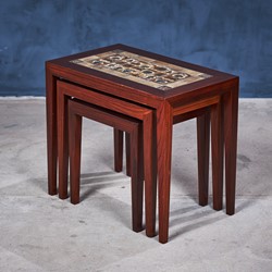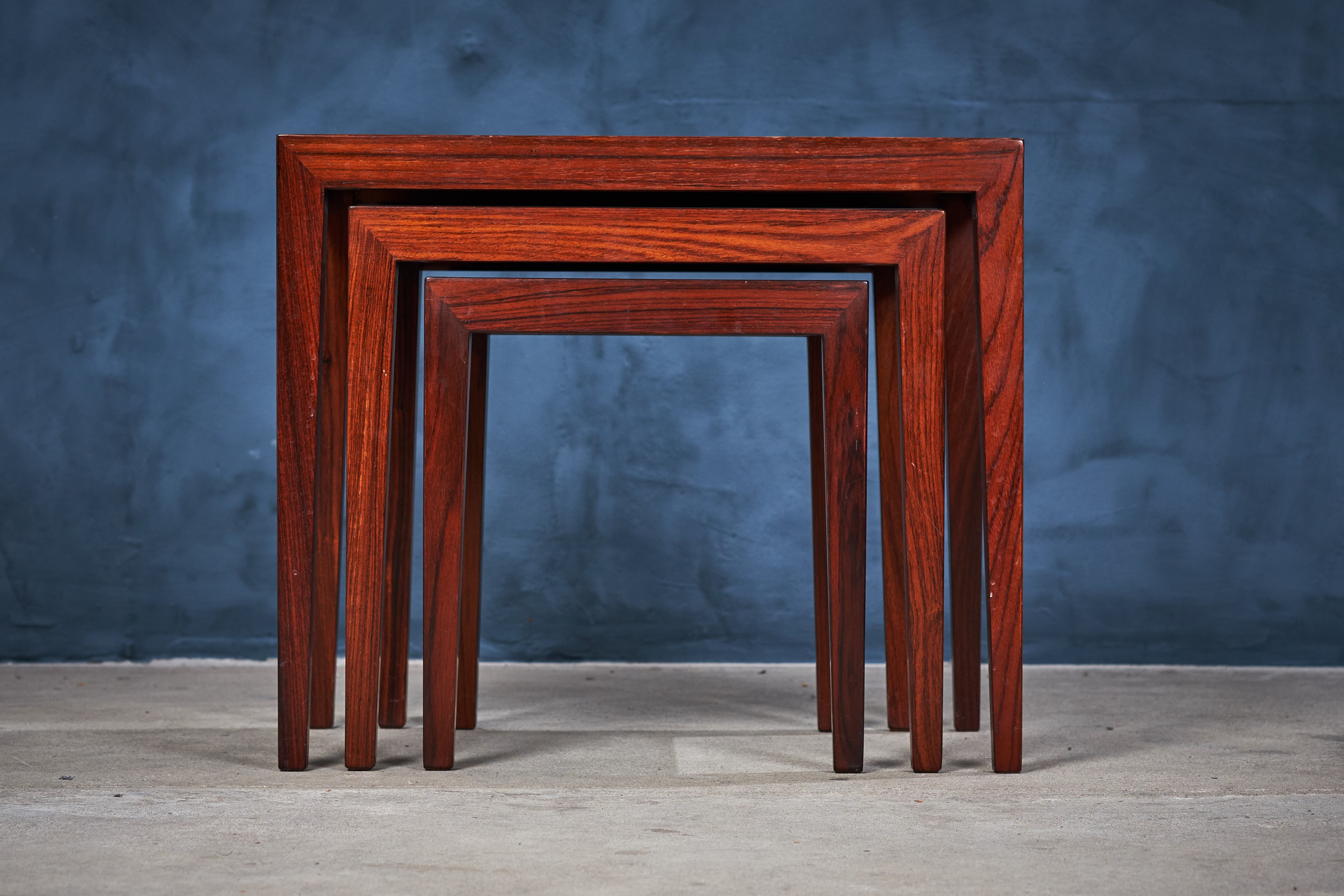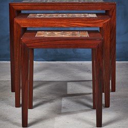 A set of three nesting tables in Rosewood with ceramic tiles from Royal Copenhagen, Denmark. Designed by Severin Hansen Jr. Manufactured by Haslev Møbelsnedkeri. His hallmark corner joinery is what makes these pieces stand out. This beautiful set would make a wonderful addition to virtually any modern setting.