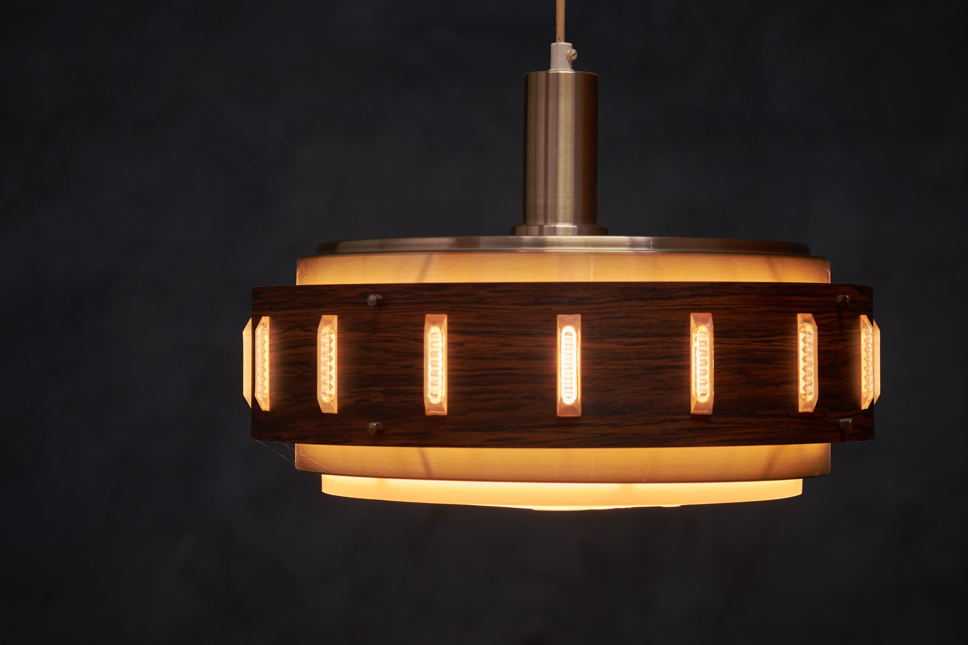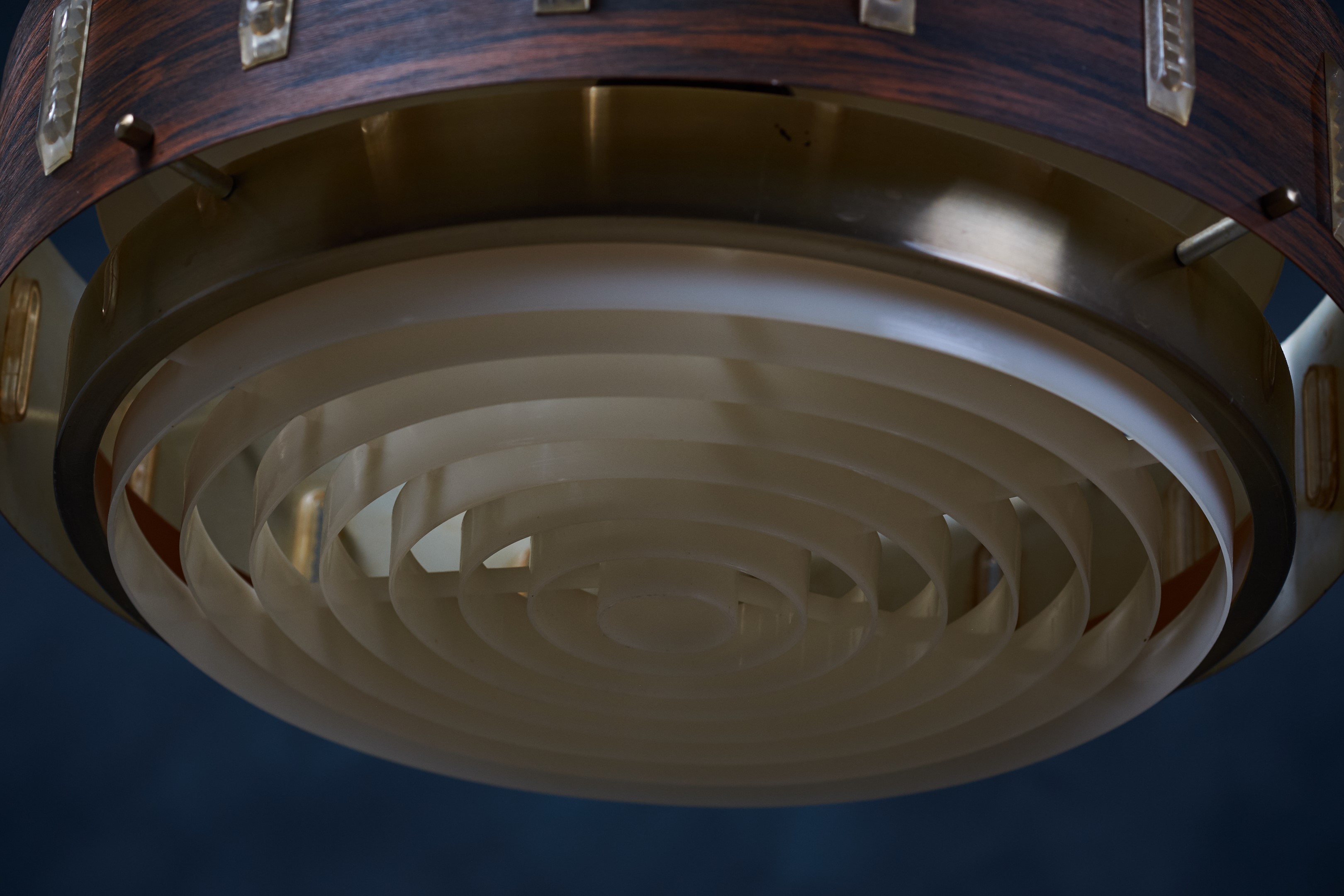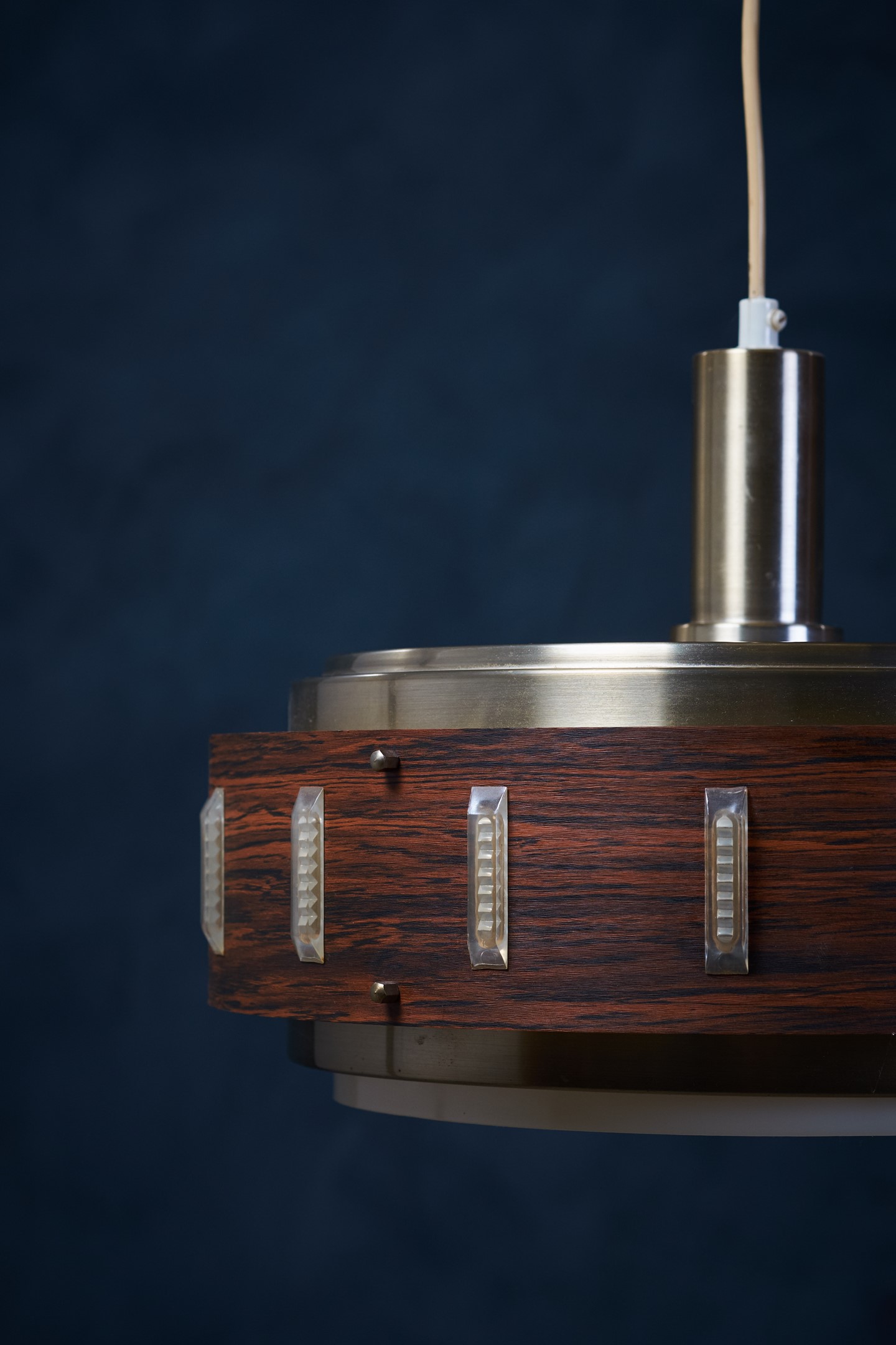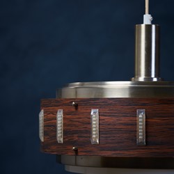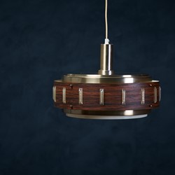 Stunning mid-century ceiling lamp with rosewood laminate on one of the shades. This lamp provides a nice and warm light and would fit in most modern environments.